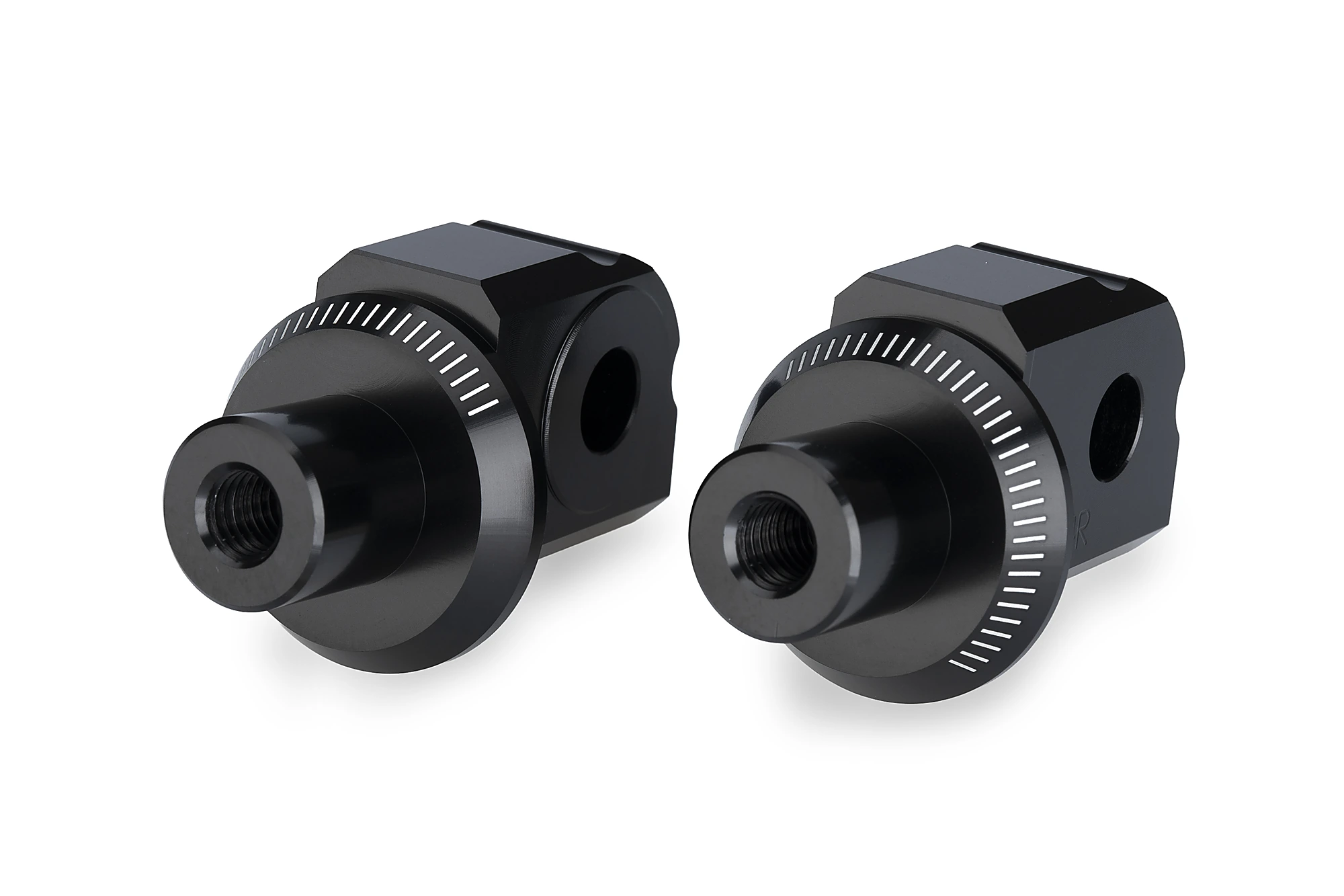 Fabricats a partir d’un bloc d’alumini mecanitzat, aquests components destaquen per la seva gran precisió i resistència. Tenen un acabat anoditzat en negre que garanteix durabilitat i un aspecte elegant. Són específics per a cada model, assegurant un ajust perfecte, i incorporen marques mil·limètriques que permeten regular l’estribera amb total precisió segons les preferències de cada motorista.