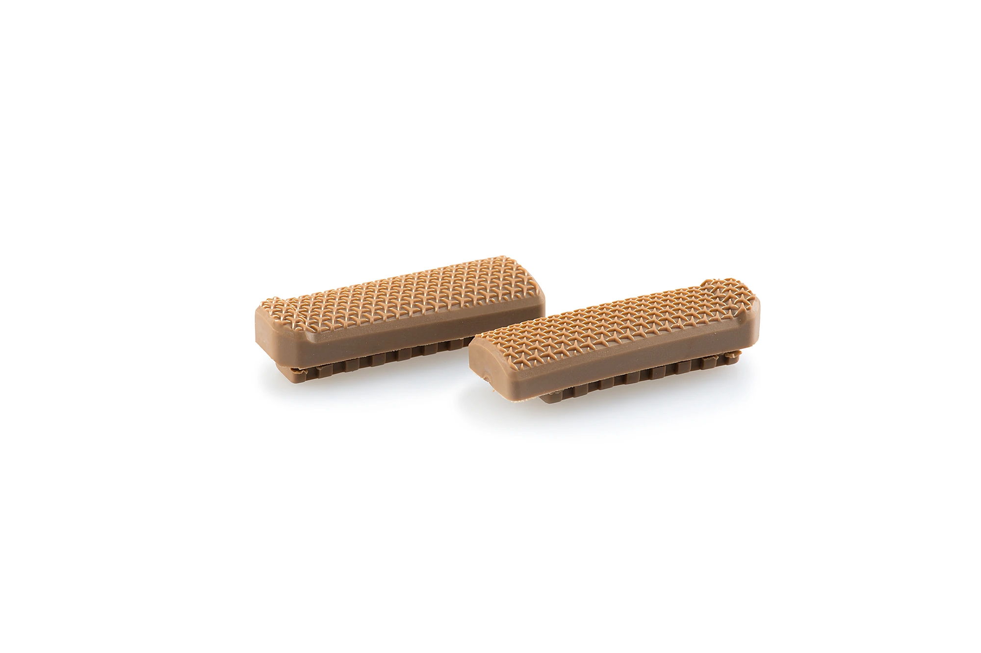 Aquests reposapeus estan fabricats partint d'un bloc d'alumini, sobre el qual es realitza un acabat anoditzat i es munta un suport de goma per millorar l'adherència de la bota i l'aïllament de les vibracions.