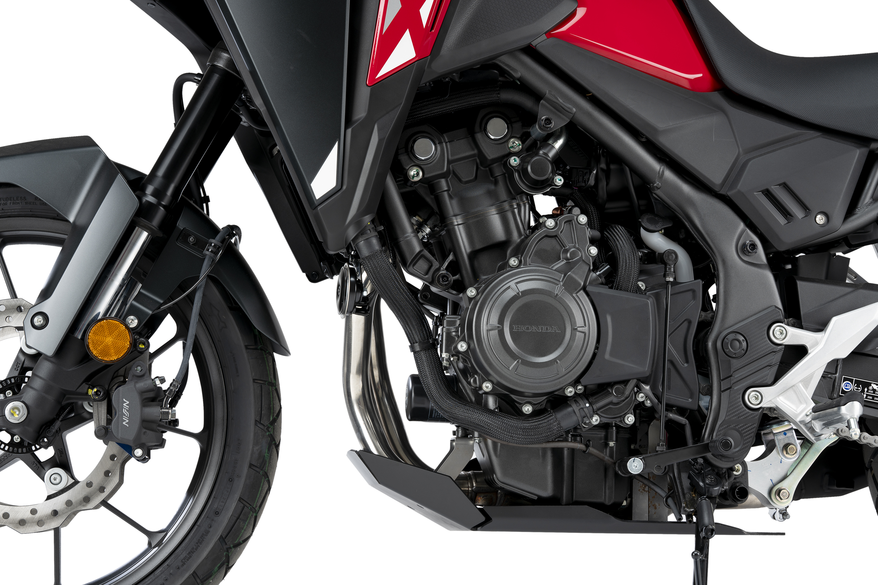 La part inferior del protector és totalment plana, cosa que facilita aixecar la moto al taller mecànic des de la part inferior si és necessari, i disposa de forats per garantir una bona refrigeració i evacuar l'aigua, fang, o petites pedres acumulades. A més de facilitar l'operació del canvi d'oli evitant treure'n el protector.