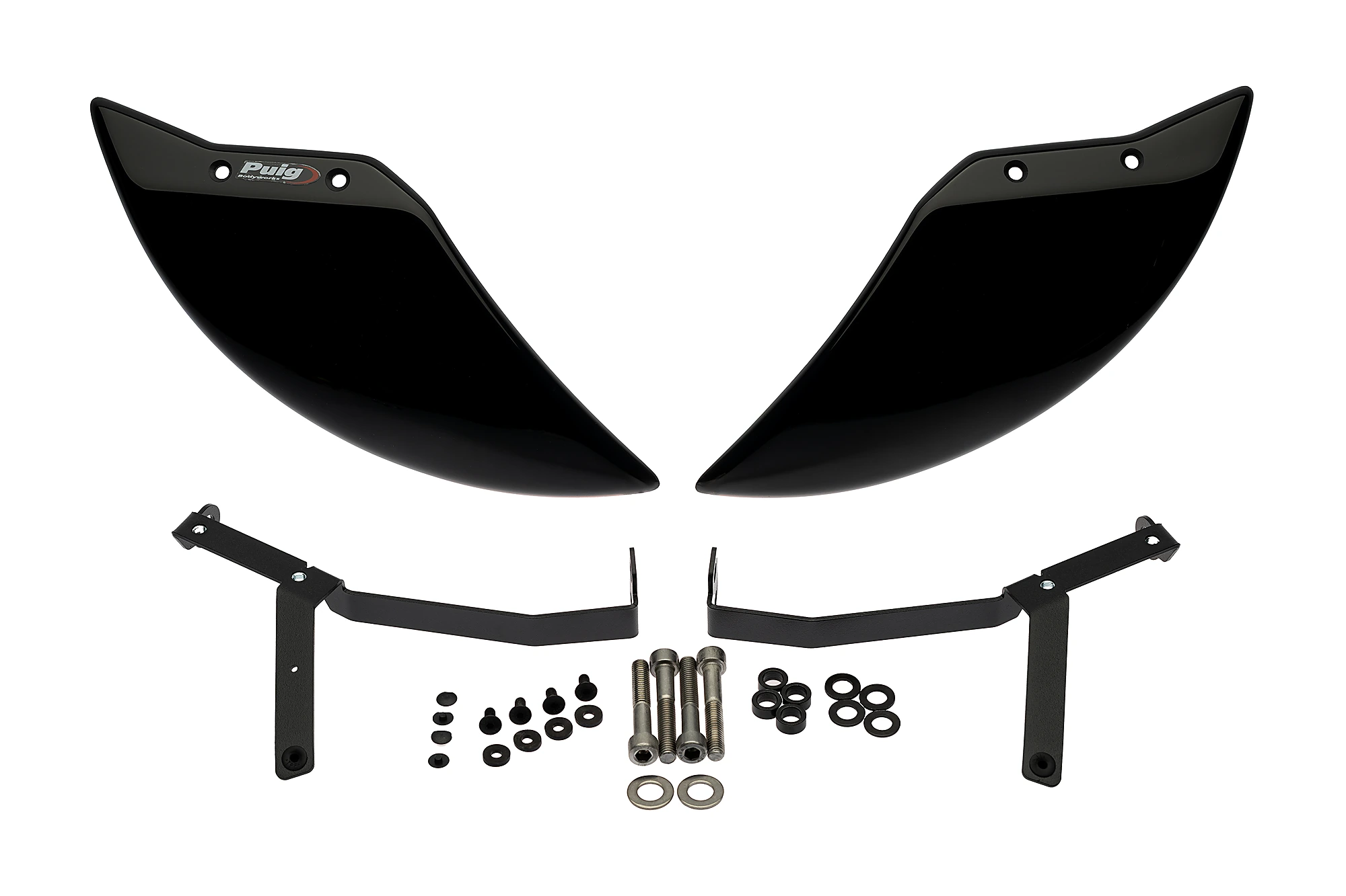 El conjunt està format per dues peces fabricades en ABS d’alta gamma de 3 mm amb les tecnologies més avançades de modelatge de plàstics, acompanyades de suports metàl·lics d’acer que aporten la rigidesa necessària, amb un discret acabat en color negre texturitzat que s’integra perfectament en l’estètica de la moto.
