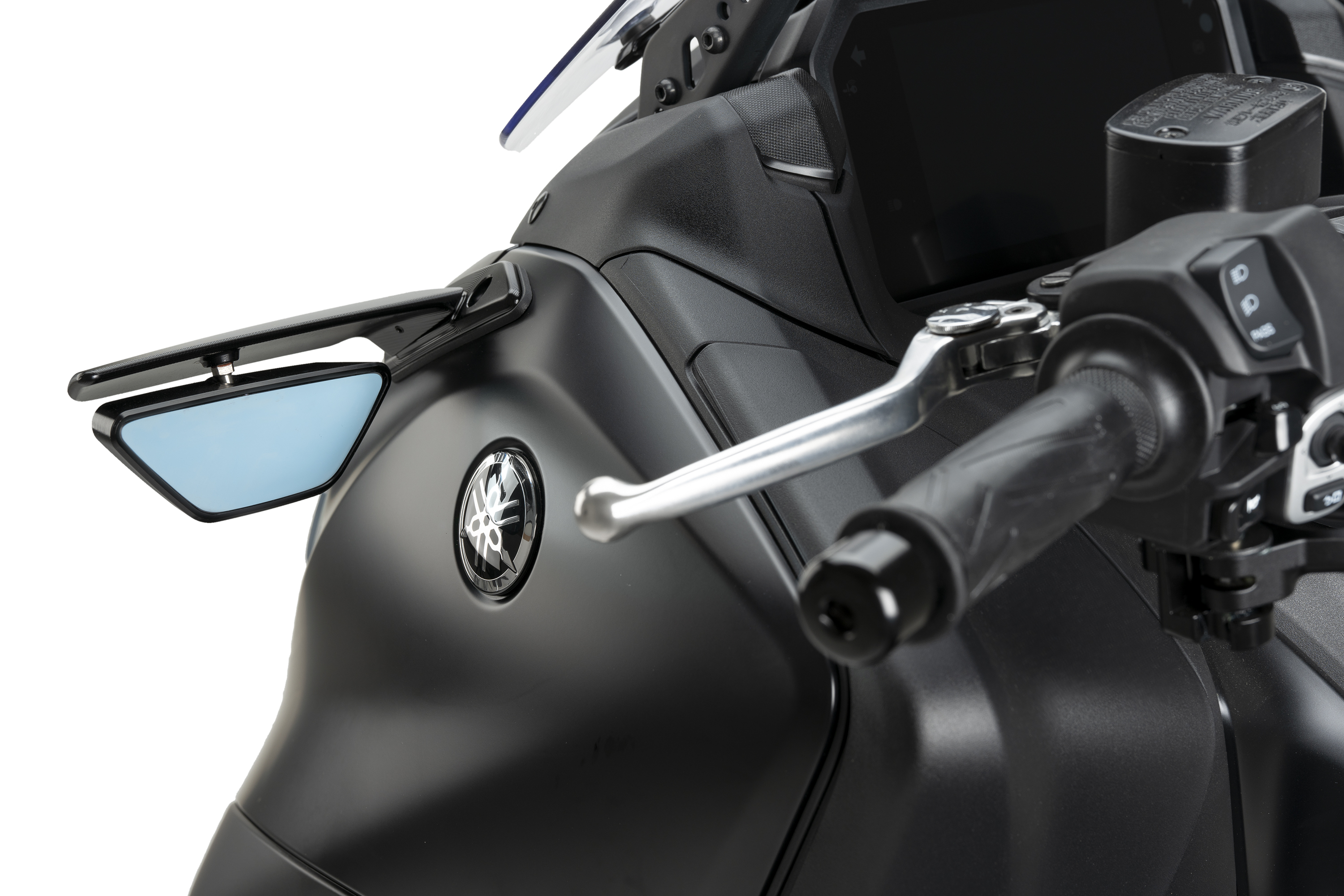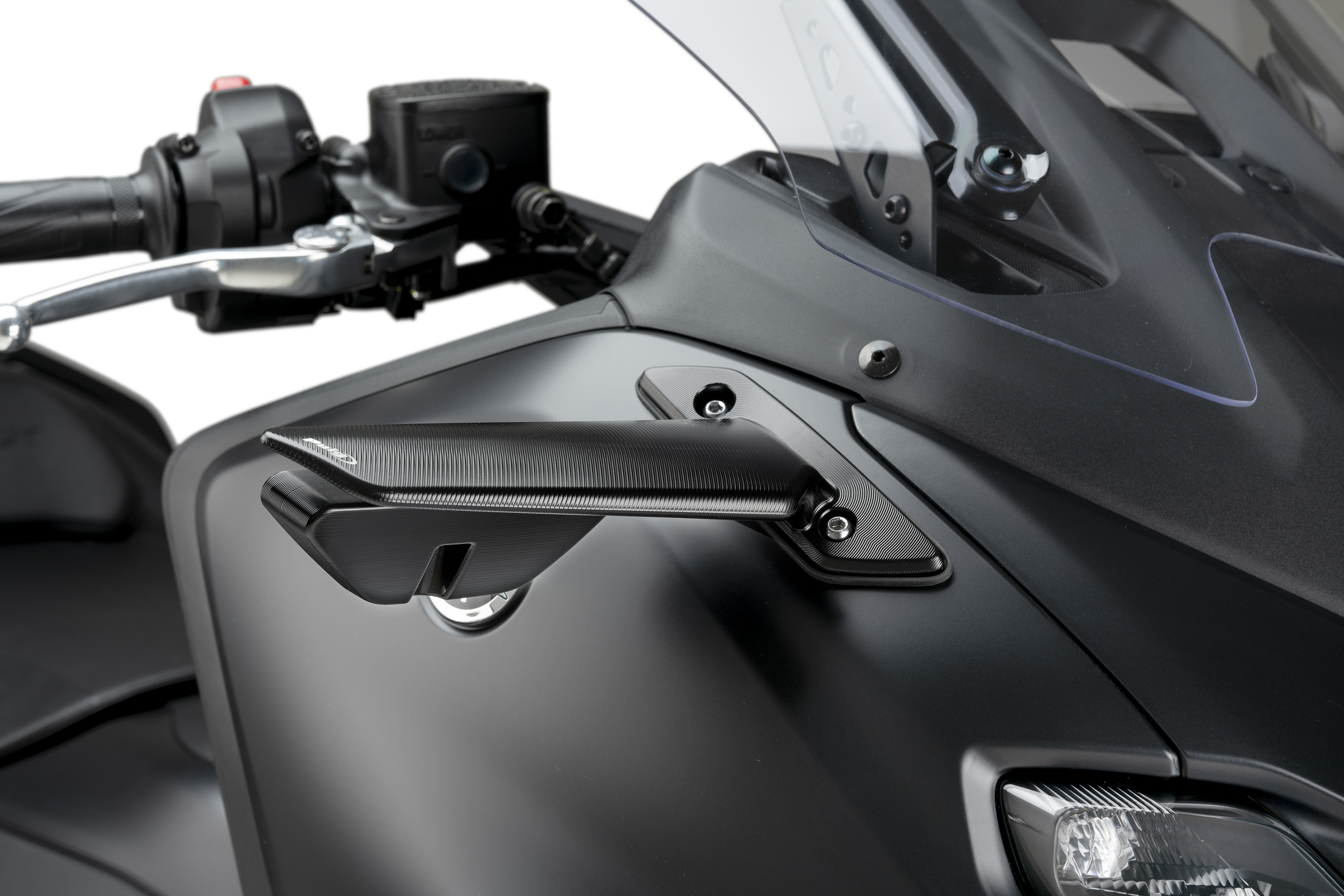 En un complet exercici de disseny, Puig ha aconseguit unir en un mateix producte els avantatges aerodinàmics dels alerons Downforce laterals amb l'eficiència dels retrovisors i l'opció d'instal·lar els intermitents TAB. Tot això en una compacta peça d´atractiva estètica, ideal per personalitzar l´estètica de les motos més esportives.