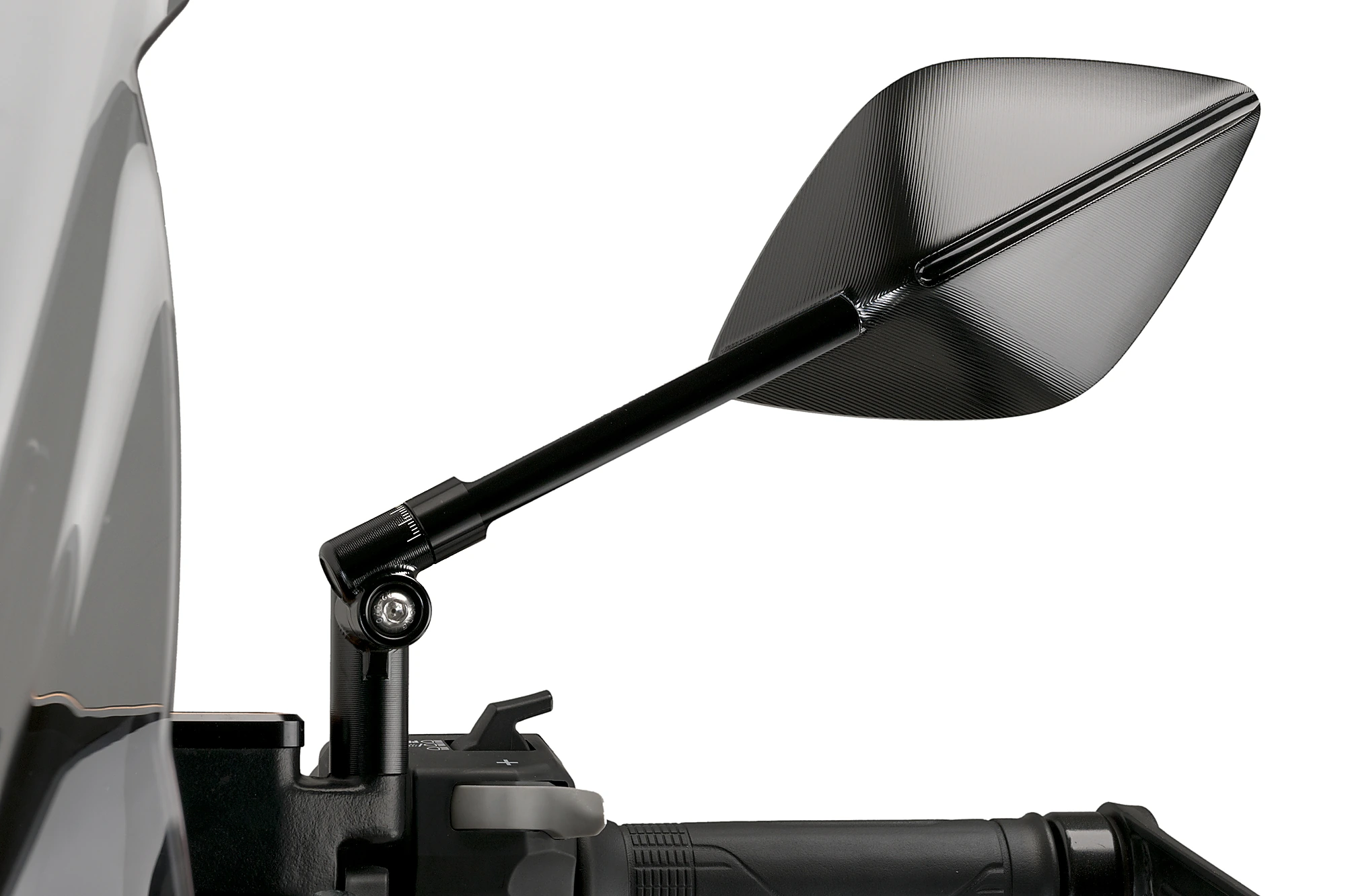L'estudiada forma del braç suport s'integra perfectament amb la carcassa del mirall donant lloc a un conjunt resistent, compacte i aerodinàmic.