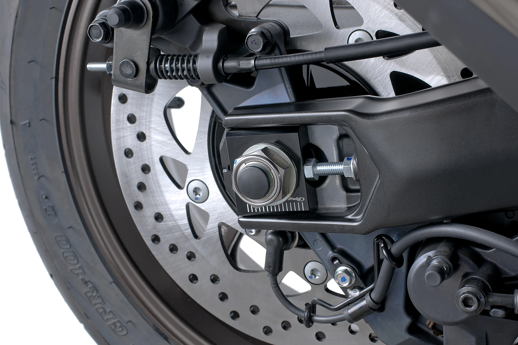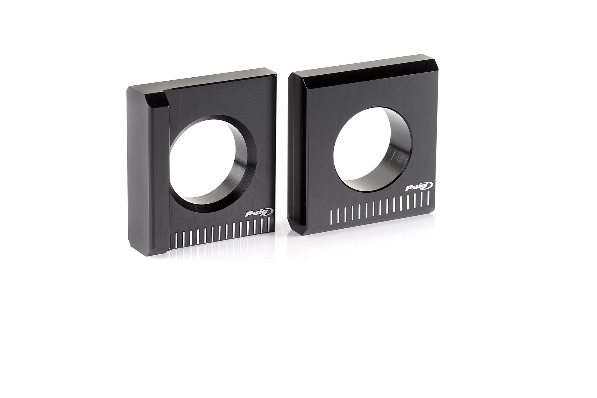 El joc de tensors per a la roda del darrere de Yamaha T-Max de Puig permeten ajustar amb precisió la corretja de l'escúter supervendes japonès. Estan fabricats en en alumini i estan mecanitzats amb una escala de mesura graduada, que permet corregir amb precisió la tensió de la corretja de transmissió. En el nostre catàleg comptem amb un disseny específic tant per a les versions a partir de l'any 2012 com per a les unitats a partir de l'any 2017, disponibles en color negre, que a més de ser funcionals milloren la presentació del braç posterior de l'escúter esportiu de Yamaha.