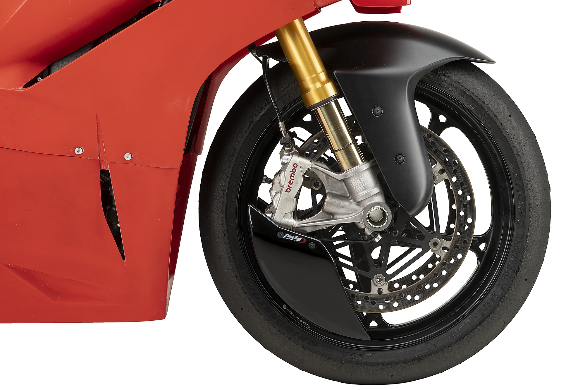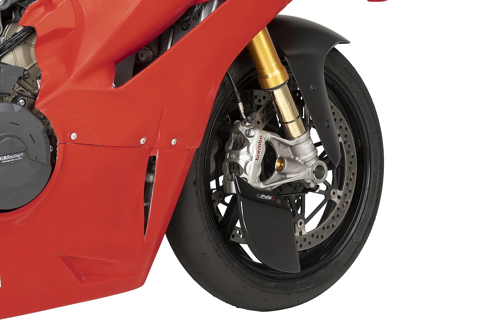 Der Raddeflektor reduziert deutlich die Turbulenzen rund um das Vorderrad, verbessert die Gesamtstabilität des Motorrads und kompensiert den aerodynamischen Widerstand, der in diesem Bereich entsteht.