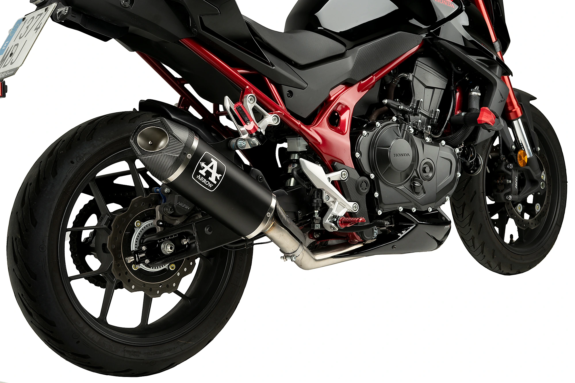 Die Seitenteile des Kiels haben sehr aggressive Linien in Form eines Stachels, die sich an die Formen des Motors anpassen, und weisen eine seltsame Vertiefung auf, die die Form des Seitenspoilers der Verkleidung der Honda Hornet imitiert.