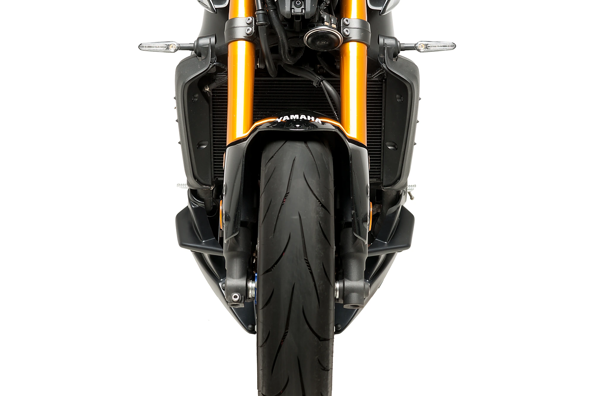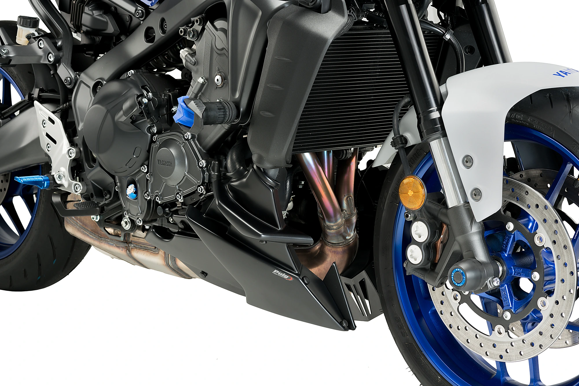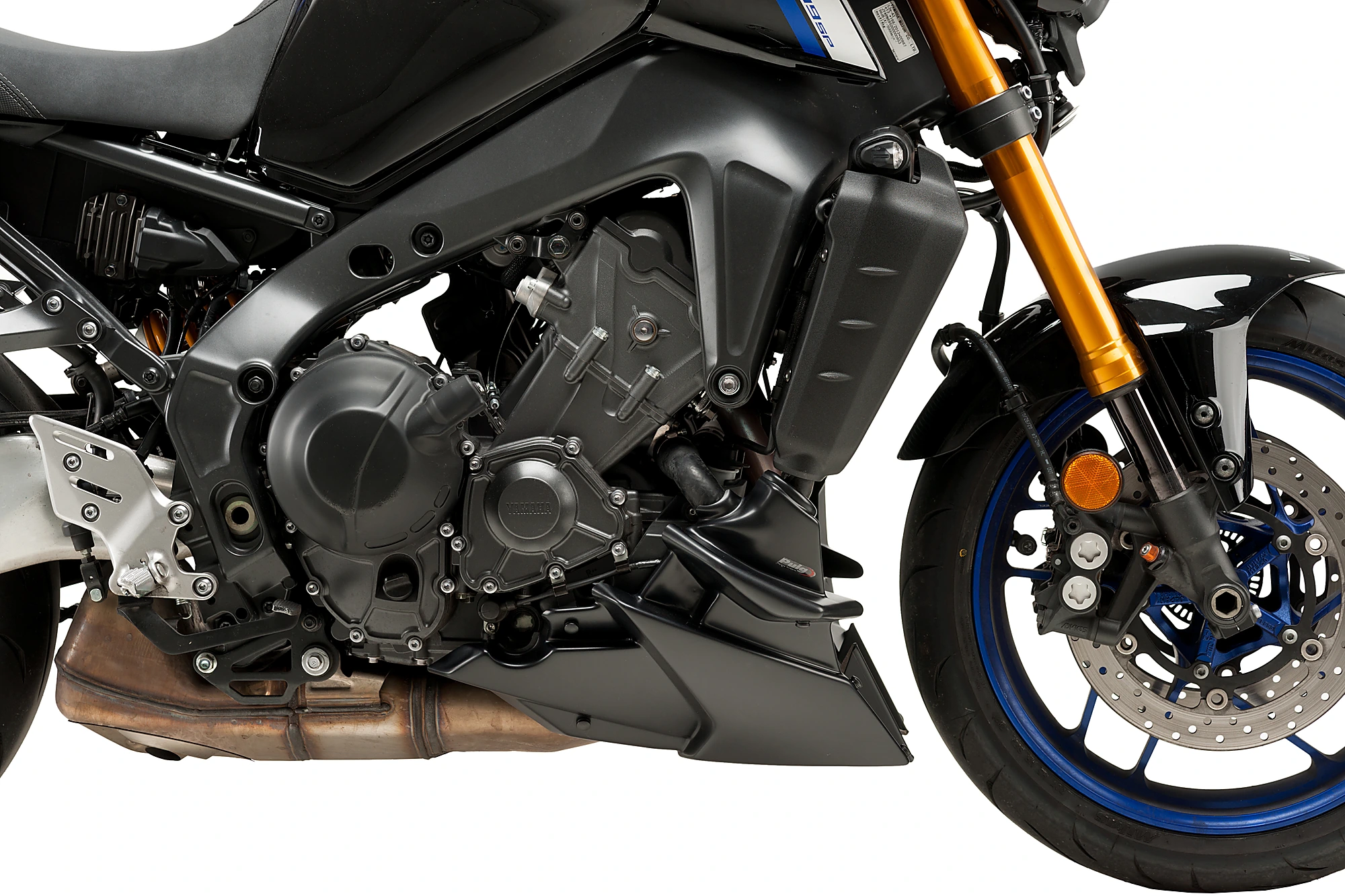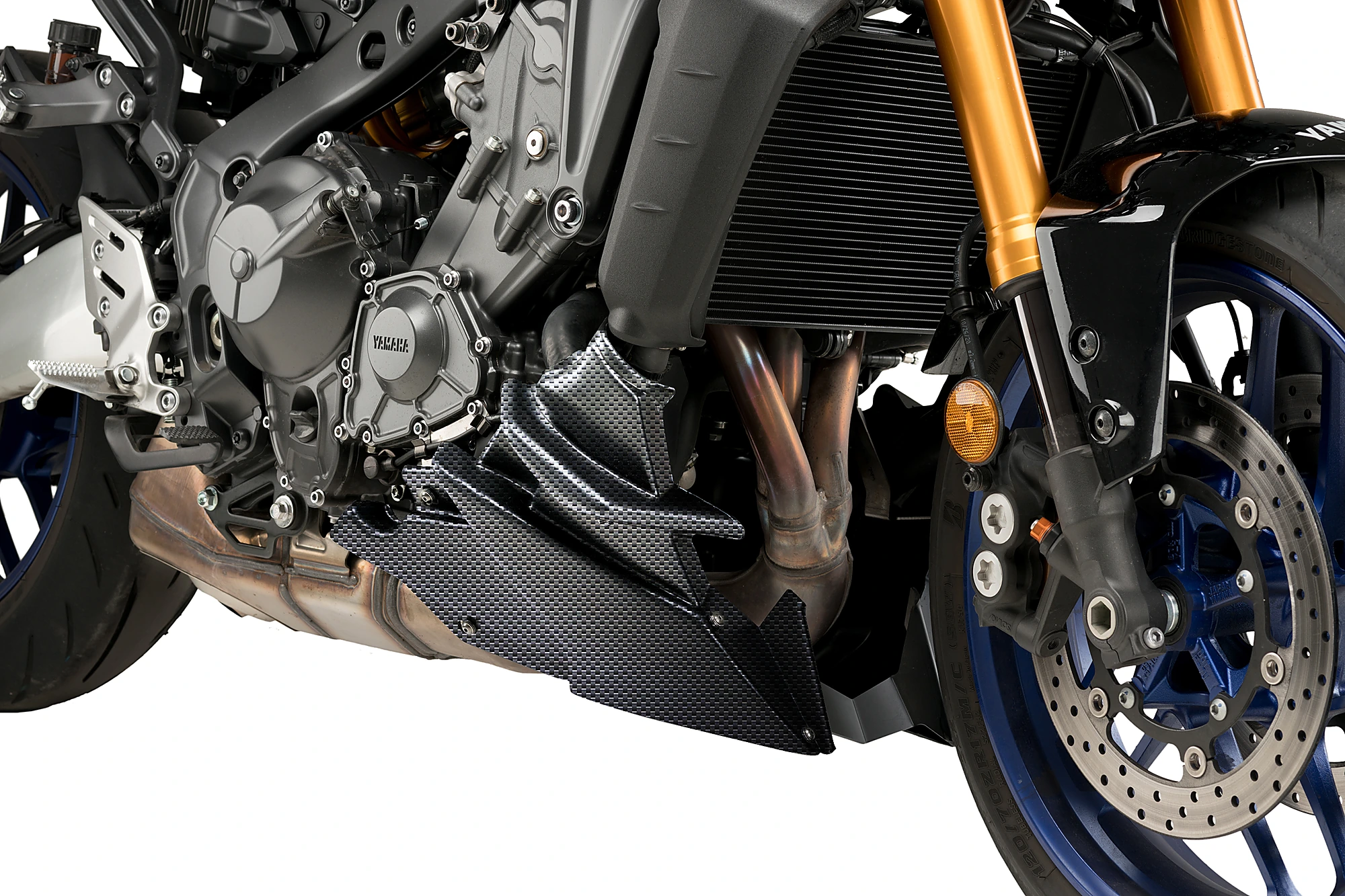 Der Motorspoiler enthält kleine, im virtuellen Windkanal getestete Spoiler, die die Luft kanalisieren und ableiten und so die aerodynamischen Eigenschaften des Motorrads verbessern.