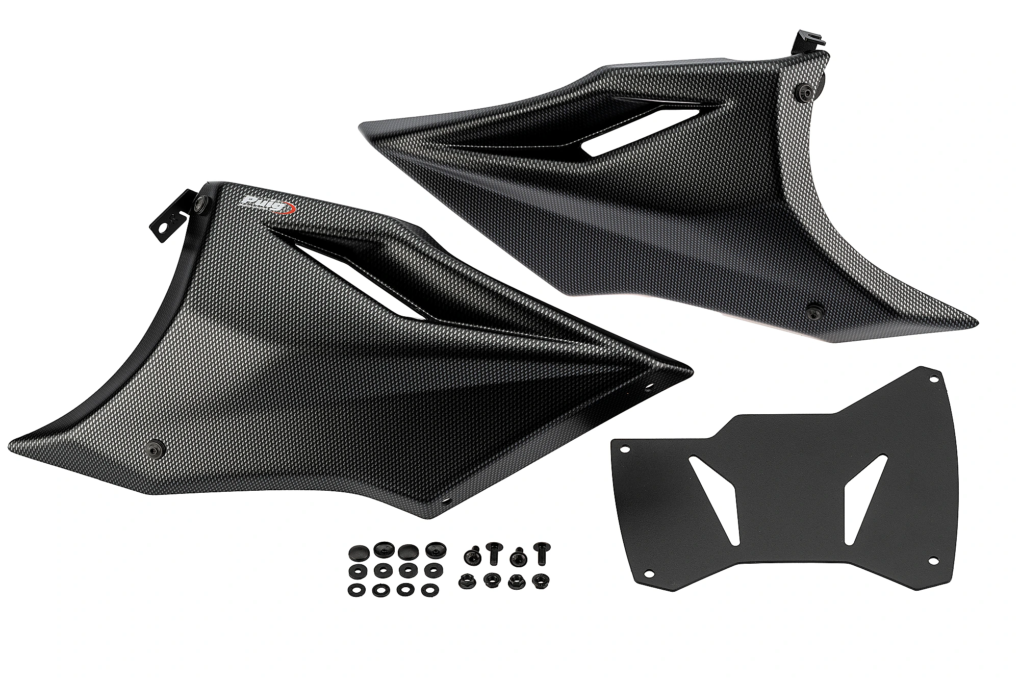 Die Verkleidung besteht aus zwei seitlichen ABS-Teilen und einem zentralen Metallteil, eine Kombination, die ein optimales Gleichgewicht zwischen Stabilität und Leichtigkeit bietet. Die seitlichen Kanten verstärken die dynamische Optik, während die großen integrierten Kanäle die Luft bei hohen Geschwindigkeiten aufnehmen und zum Motorbereich leiten, wodurch die Kühlung verbessert wird. Die Designöffnungen erfüllen nicht nur eine technische Funktion, sondern verleihen auch optische Leichtigkeit und einen stärkeren Racing-Look.