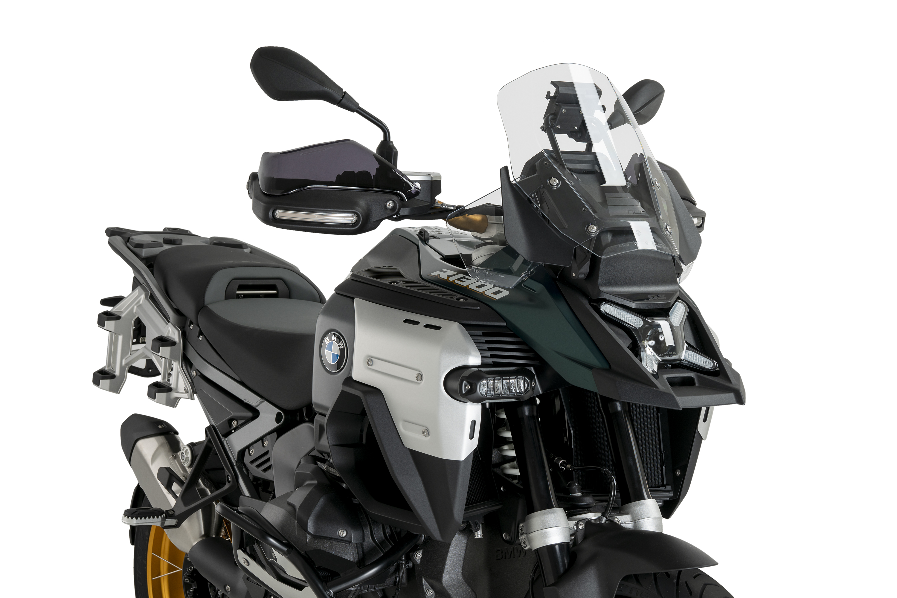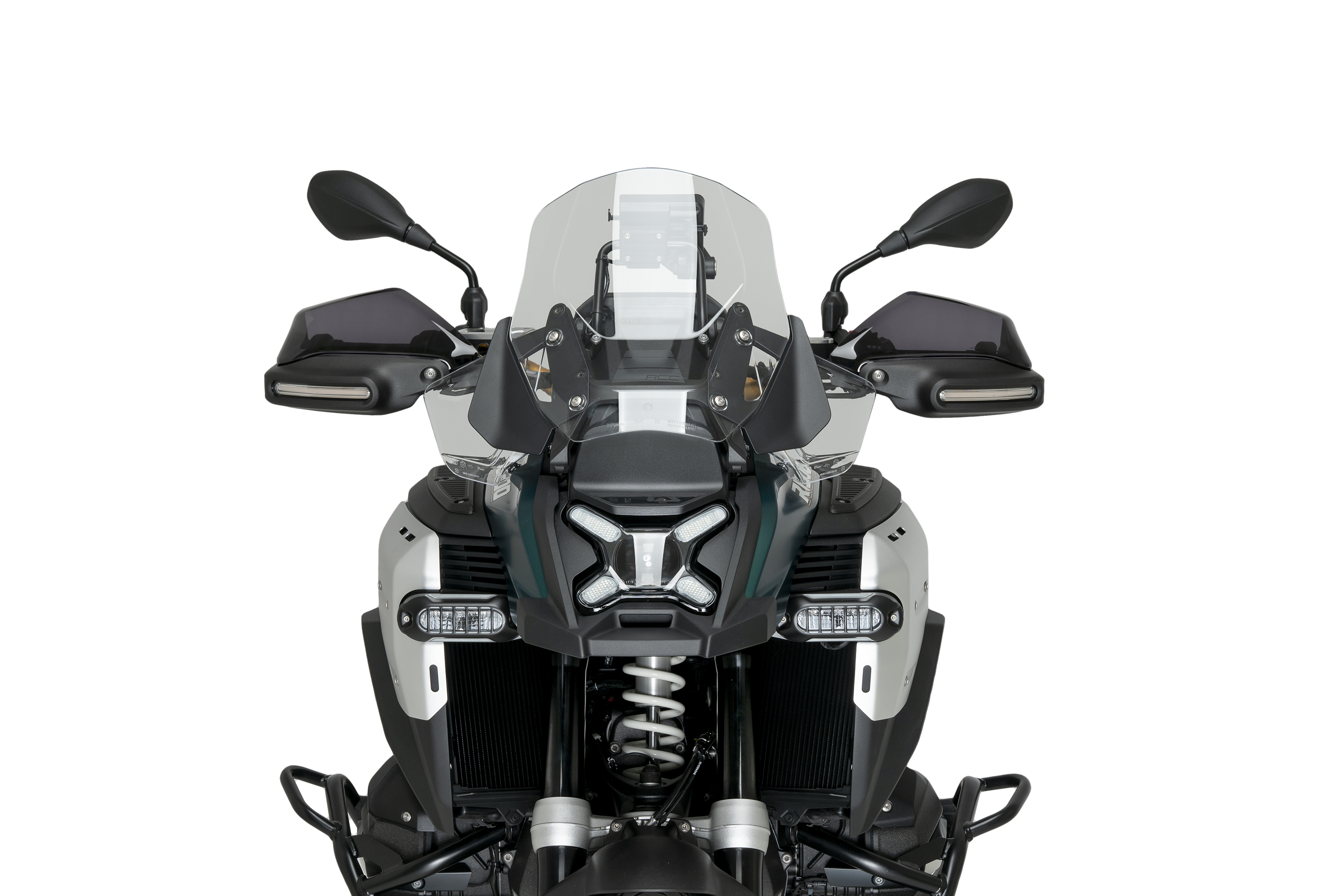 Die Handschutzverlängerung von Puig, speziell für die BMW R1300GS entwickelt, bewahrt die charakteristischen Designlinien der ikonischen deutschen Trail, indem sie die Form des Handschutzes stilisiert und Formen im Griffbereich minimiert, während sie den Schutz und die Aerodynamik des Motorrads verbessert.