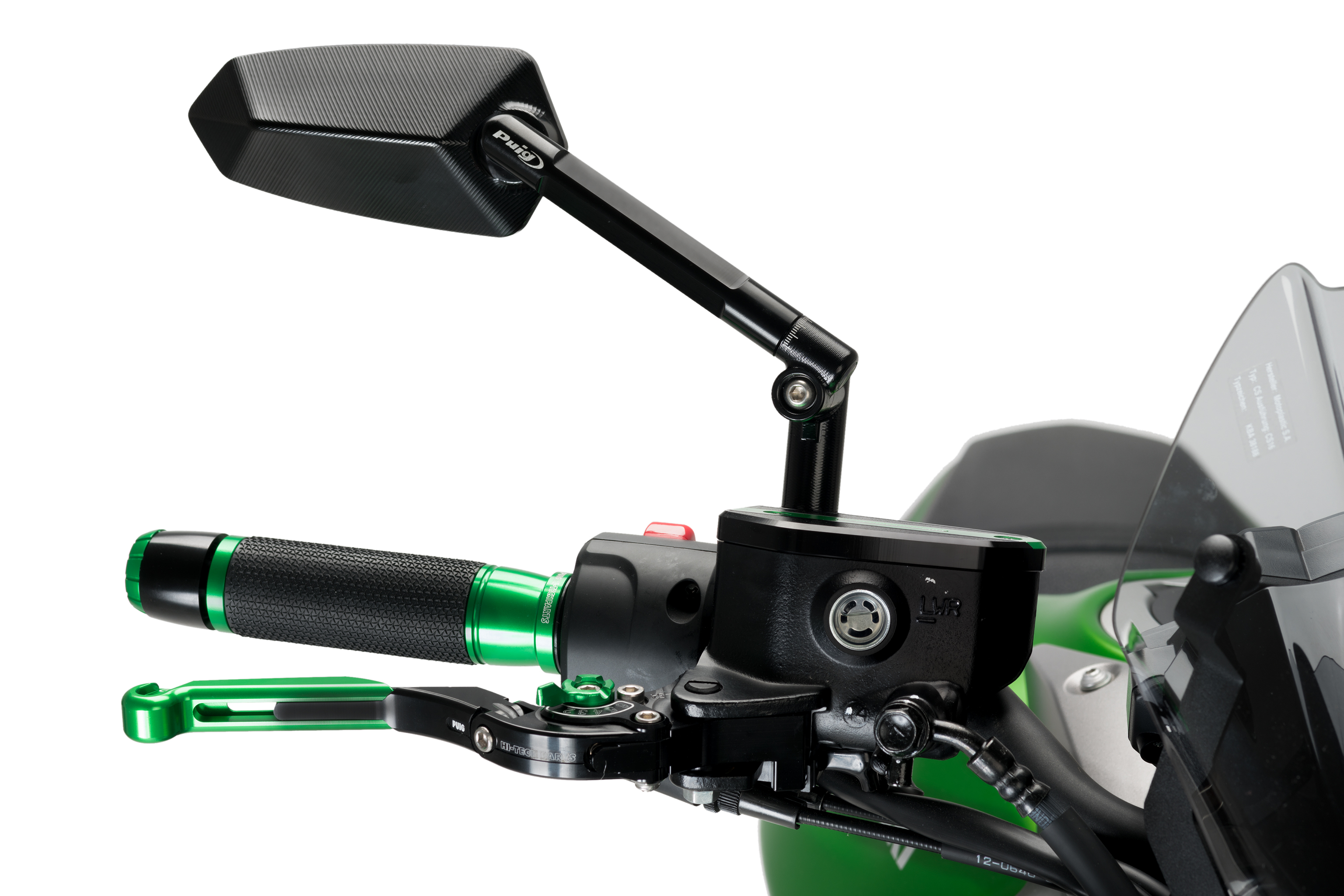 Dieses Zubehör wurde gemäß den Puig Hi-Tech-Teileparametern entwickelt. Er ist nicht homologiert. Dank seines Kugelgelenksystems ist der Spiegel sowohl in der Höhe als auch in der Neigung einstellbar. Außerdem können die Spiegel mithilfe von Adaptern sowohl an die Spiegelstange wie auch an die Originalverkleidung angepasst werden.