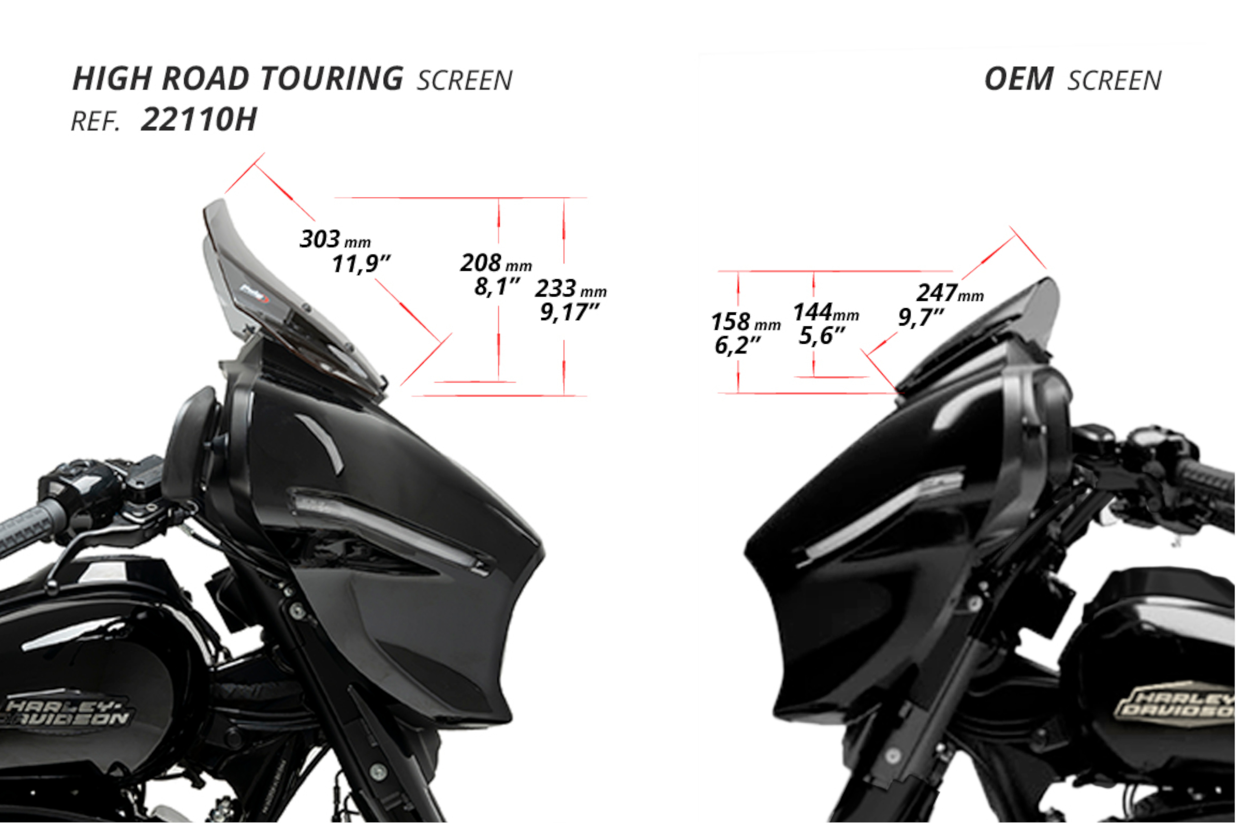 Die Gesamtmaße betragen 700 mm Breite und 303 mm Höhe, 75 mm höher als das Standard-Originalwindschild. Es entspricht den strengsten Homologationsstandards, wie dem deutschen TÜV.