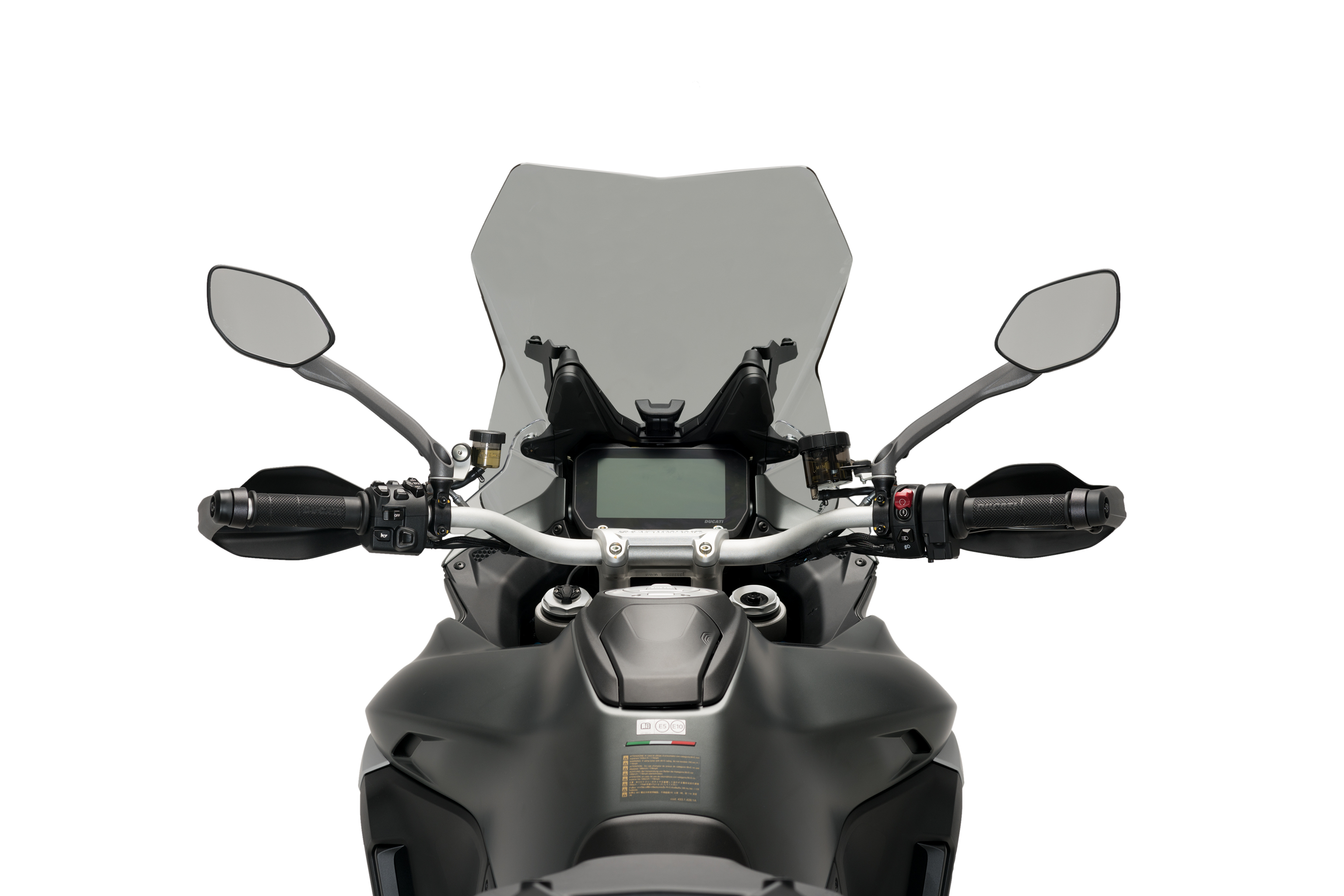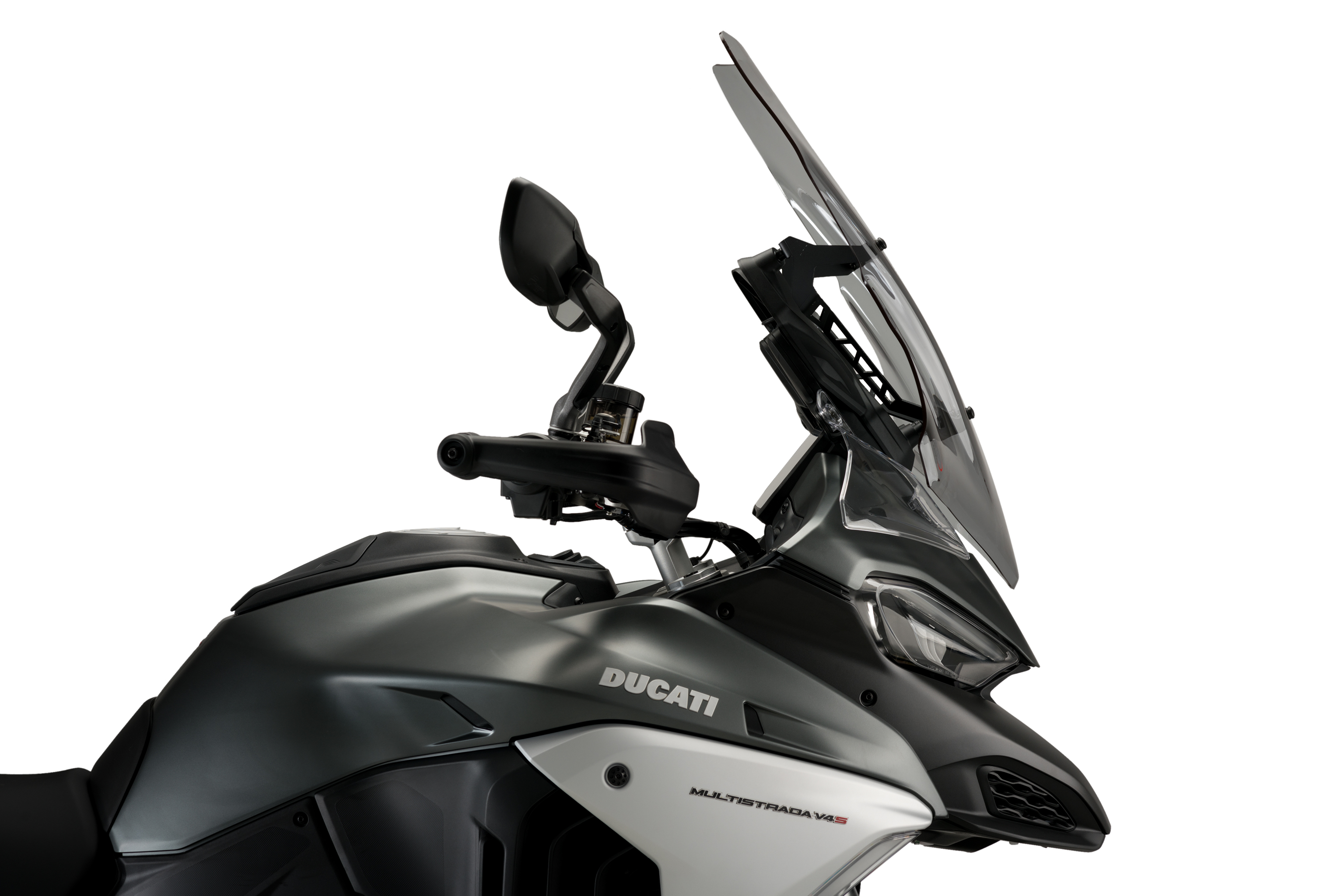 Die neue Puig Touring-Scheibe für die Ducati Multistada V4 2021 ist eine Windschutzscheibe mit einem raffinierten Design, die aerodynamisch entwickelt wurde, um den Fahrer während der Fahrt wirksam zu schützen, ohne das elegante Design des Motorradmodells des italienischen Herstellers zu verändern.