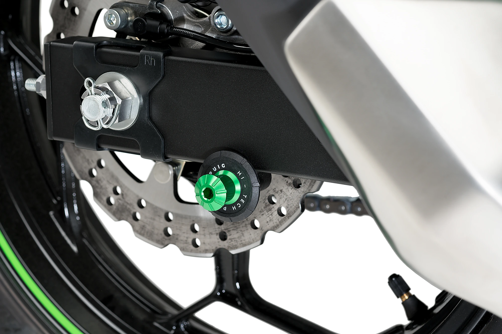 Spulen dienen als Anpassungshilfe, um einen Ständer zu montieren und um das Motorrad schnell und sicher anzuheben. Für diese Anwendung, möchten wir Ihnen den Spool Pro der Marke Puig vorstellen. Hergestellt aus eloxiertem Aluminium (reduziertes Gewicht von 32 Gramm), garantiert es den Schutz des Schwenkarms vor möglichen Kratzern, da es mit einer schwarzen Nylon-Unterlegscheibe ausgestattet ist, auf die die Puig Hi-Tech-Teile geätzt sind.