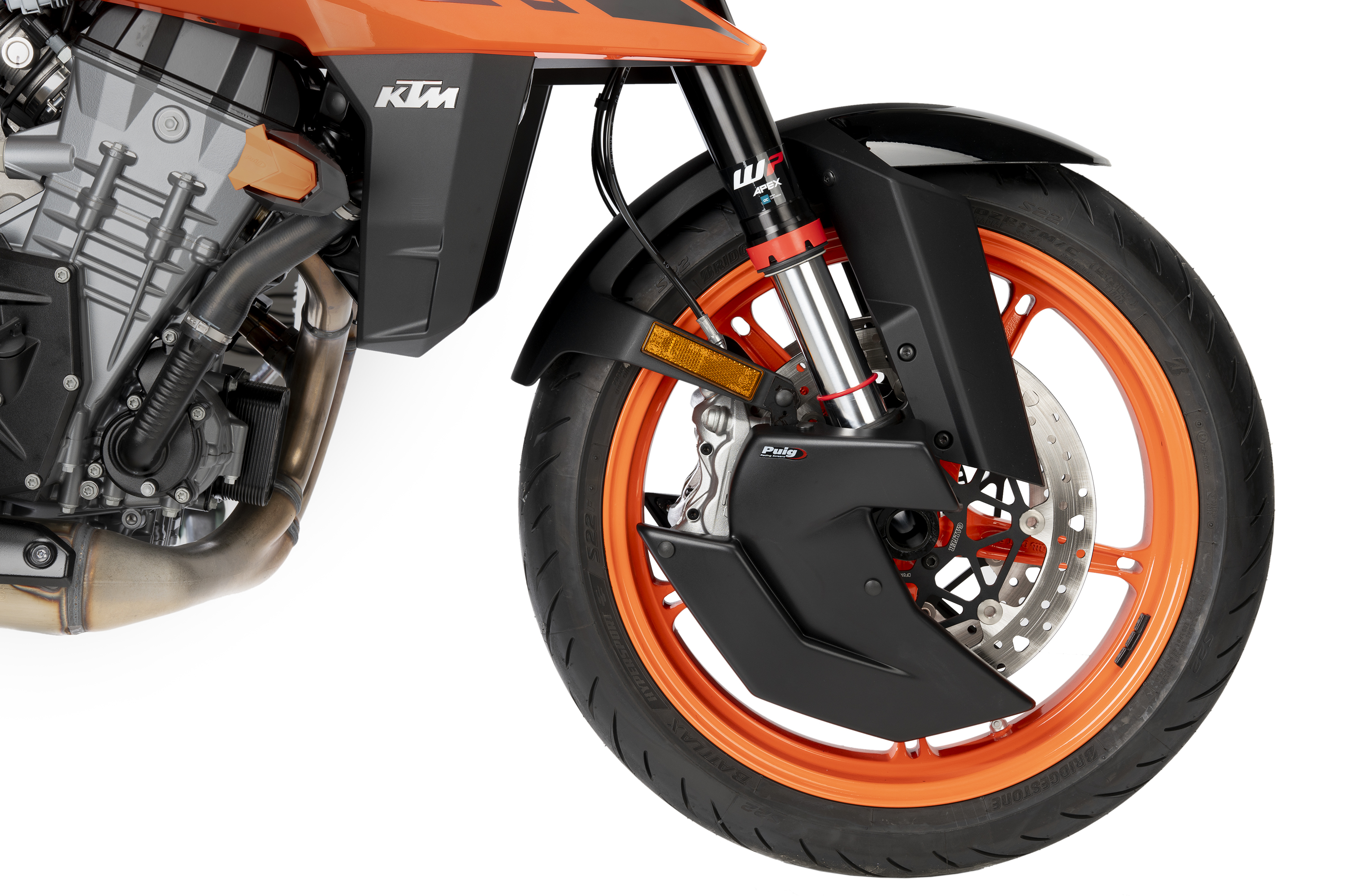 Sein durchdachtes Design sorgt nicht nur für eine sportlichere und individuellere Optik, sondern verbessert auch die Bremsleistung und eliminiert Turbulenzen am Vorderrad, indem es eine teilweise linsenförmige Abdeckung schafft, die die Aerodynamik und Stabilität des Motorrads, insbesondere bei hohen Geschwindigkeiten, fördert.
