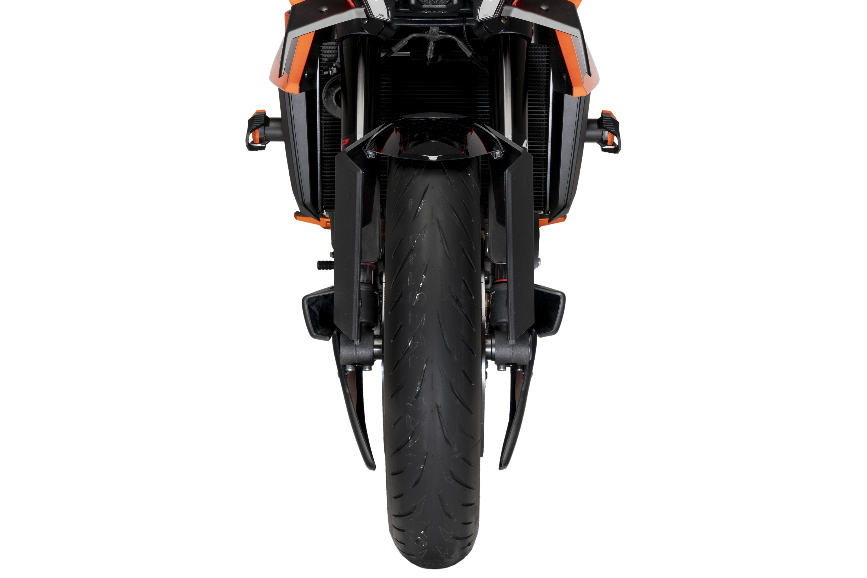 Sein durchdachtes Design eliminiert nicht nur eine sportlichere und individuellere Ästhetik, sondern beseitigt auch Turbulenzen am Vorderrad, indem es eine teilweise linsenförmige Abdeckung schafft, die die Aerodynamik des Motorrads begünstigt, insbesondere bei hohen Geschwindigkeiten. Inklusive robuster, leichter Aluminiumhalterungen in dezent strukturiertem Schwarz.