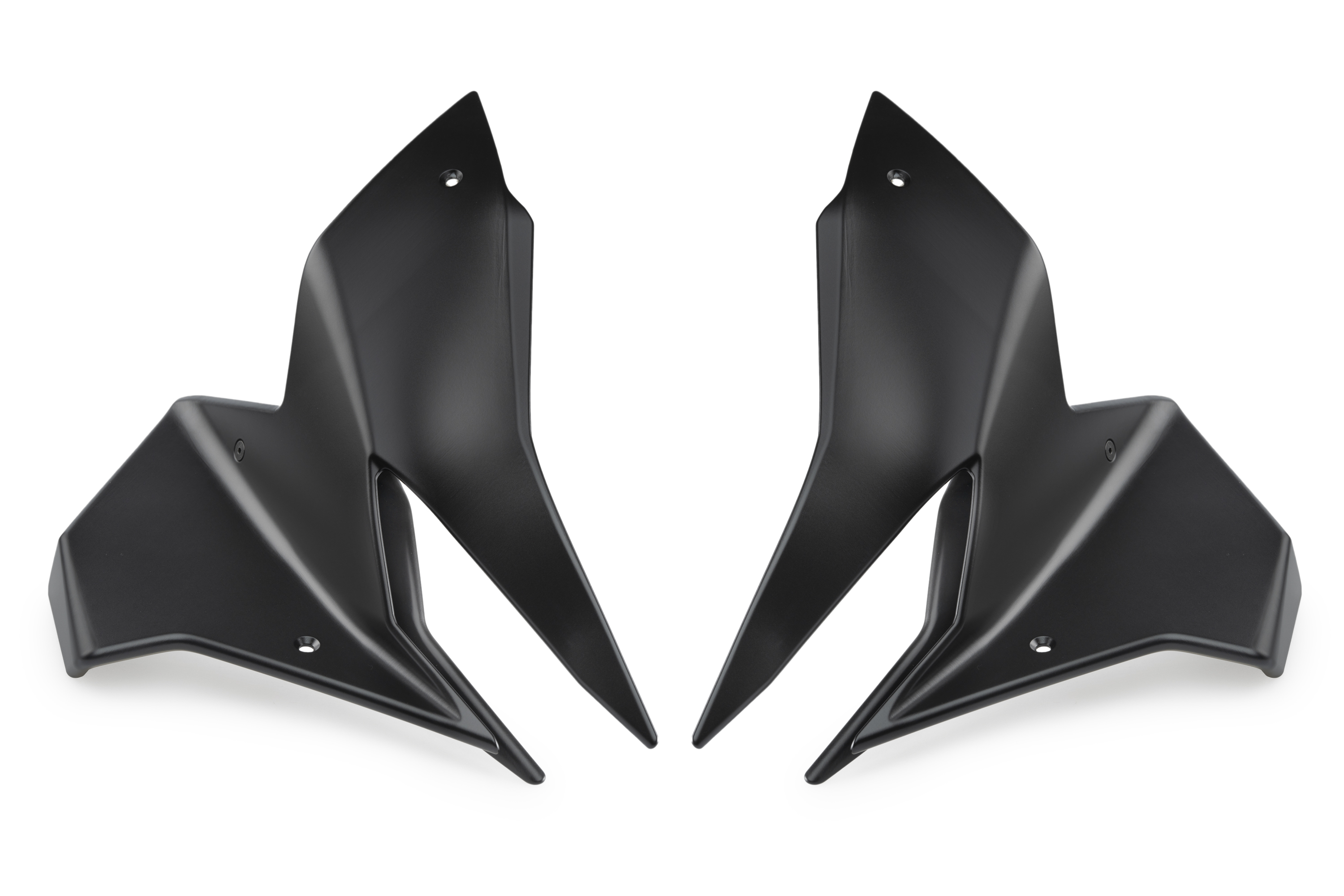 Ihr Design vergrößert optisch die Frontpartie des Motorrads durch große geneigte Flächen, die ihm nicht nur eine imposantere Präsenz verleihen, sondern auch Abtrieb (Downforce) auf die Vorderachse bei hoher Geschwindigkeit erzeugen. Dieser Effekt entsteht, weil die Luft, die über die Oberseite des Flügels strömt, Druck nach unten ausübt, während der untere Luftstrom beschleunigt und einen Unterdruck erzeugt. Das Ergebnis ist ein aerodynamischer Anpressdruck von bis zu 5,4 kg auf die Vorderachse mit zahlreichen Vorteilen für das Fahrverhalten: