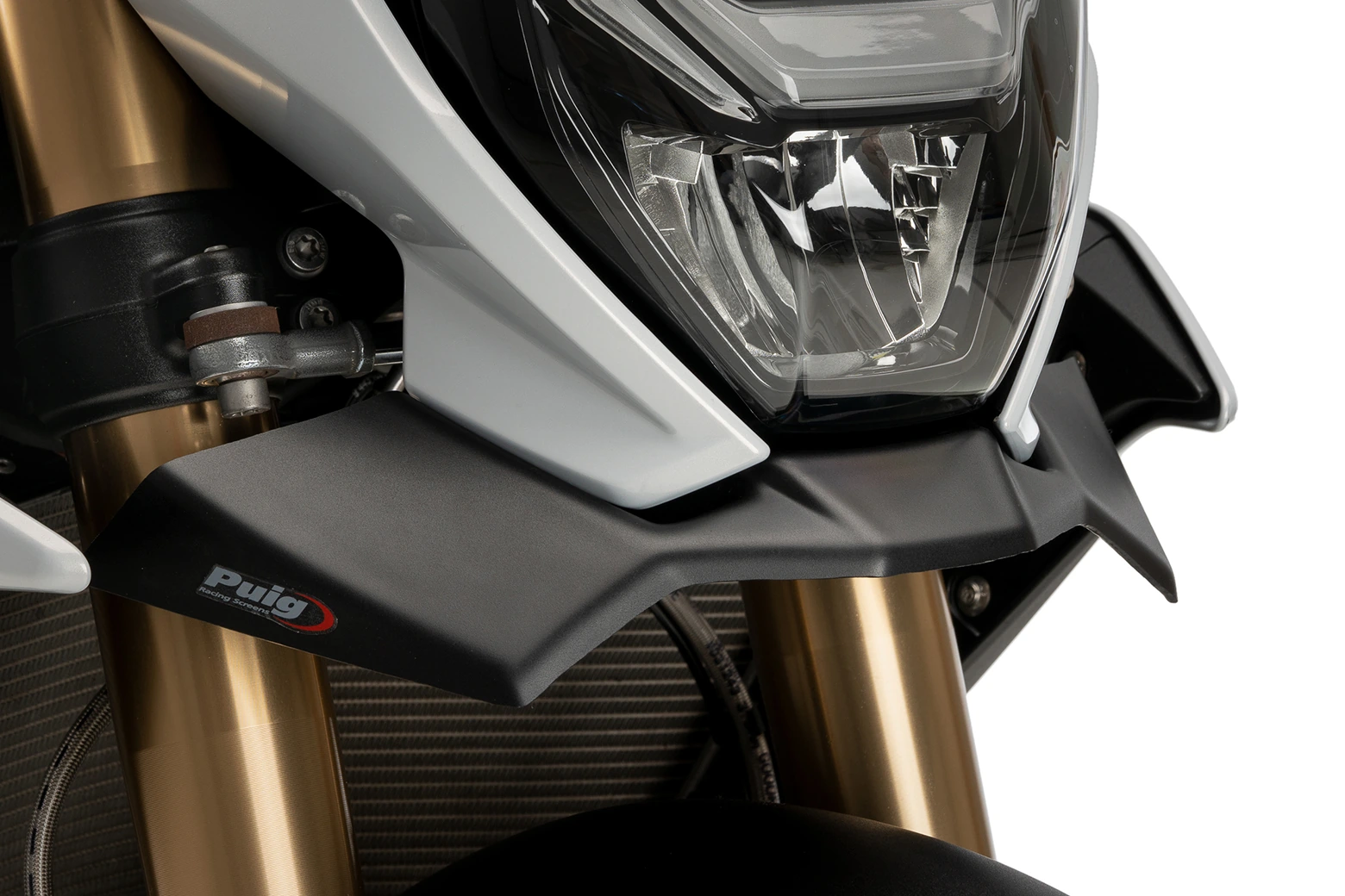 Was die Aerodynamik betrifft, so leitet der neue Naked-Frontspoiler von Puig die Luft, die den Kühler erreicht, nach vorne und sorgt dank seiner Formen für fast 2 kg Abtrieb am Vorderrad, was wiederum einen Anti-Wheelie-Effekt, einen Anti-Shimmie-Effekt (mehr Stabilität bei hohen Geschwindigkeiten), mehr Gelassenheit beim Bremsen und mehr Stabilität bei Richtungswechseln bewirkt.