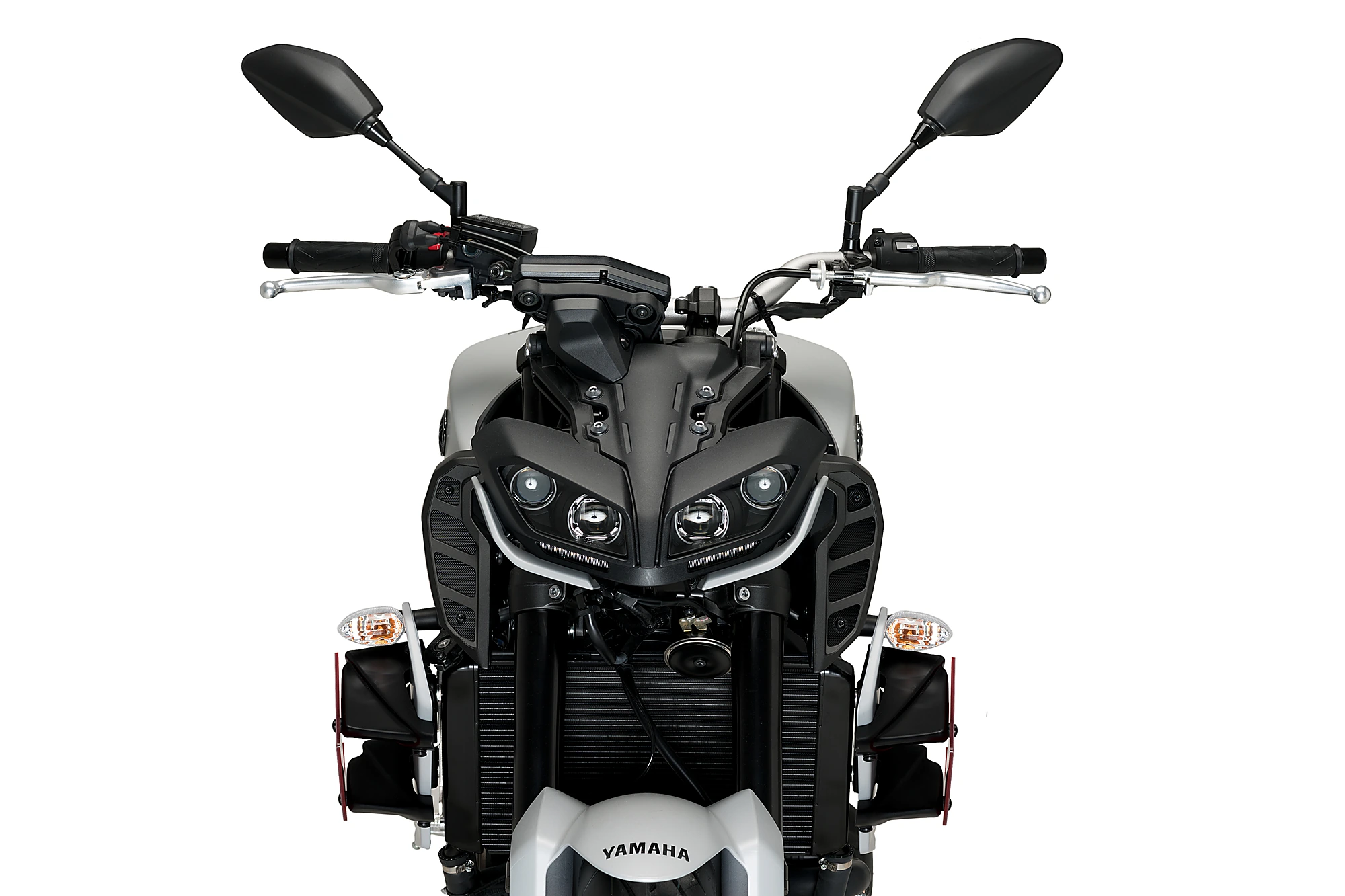 Die naked Spoiler für die Yamaha MT-09 bestehen aus zwei Teilen. Einerseits aus den vier Spoilerteilen, die windschnittig geformt sind, diese setzten sich zusammen und bilden den Hauptteil des Motorschutzes. Dieser wurde auf das Grundlichste Erforscht, um ein die beste aerodynamische Effizienz zu erreichen. Der Motorspoiler passt sich perfekt an den Kühler Ihrer MT-09 an, erzeugt dabei einen Abtrieb au die Vorderachse und schafft so mehr Halt und Stabilität bei Bremsmanövern und erzielt auch noch einen Anti-Wheelie-Effekt.