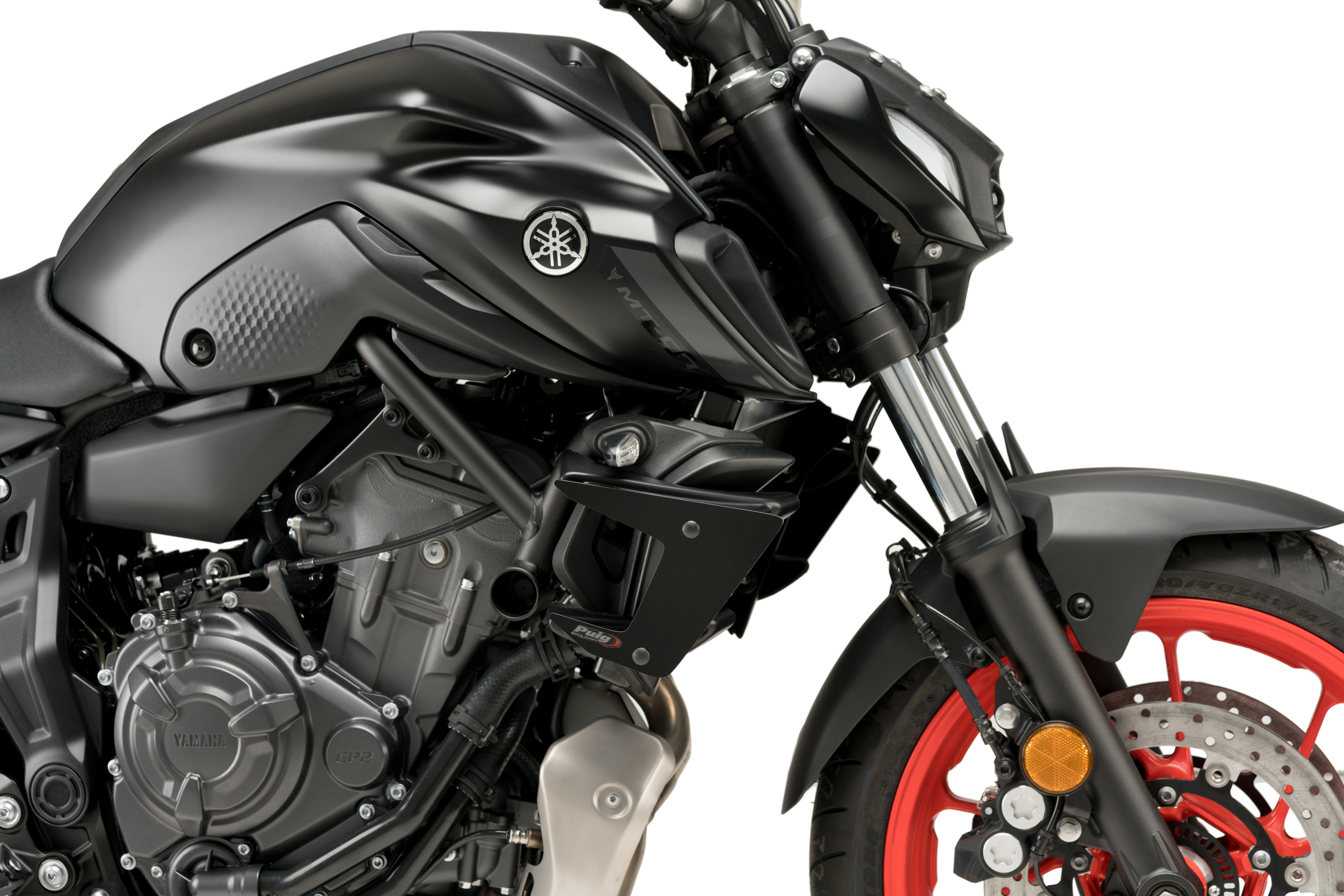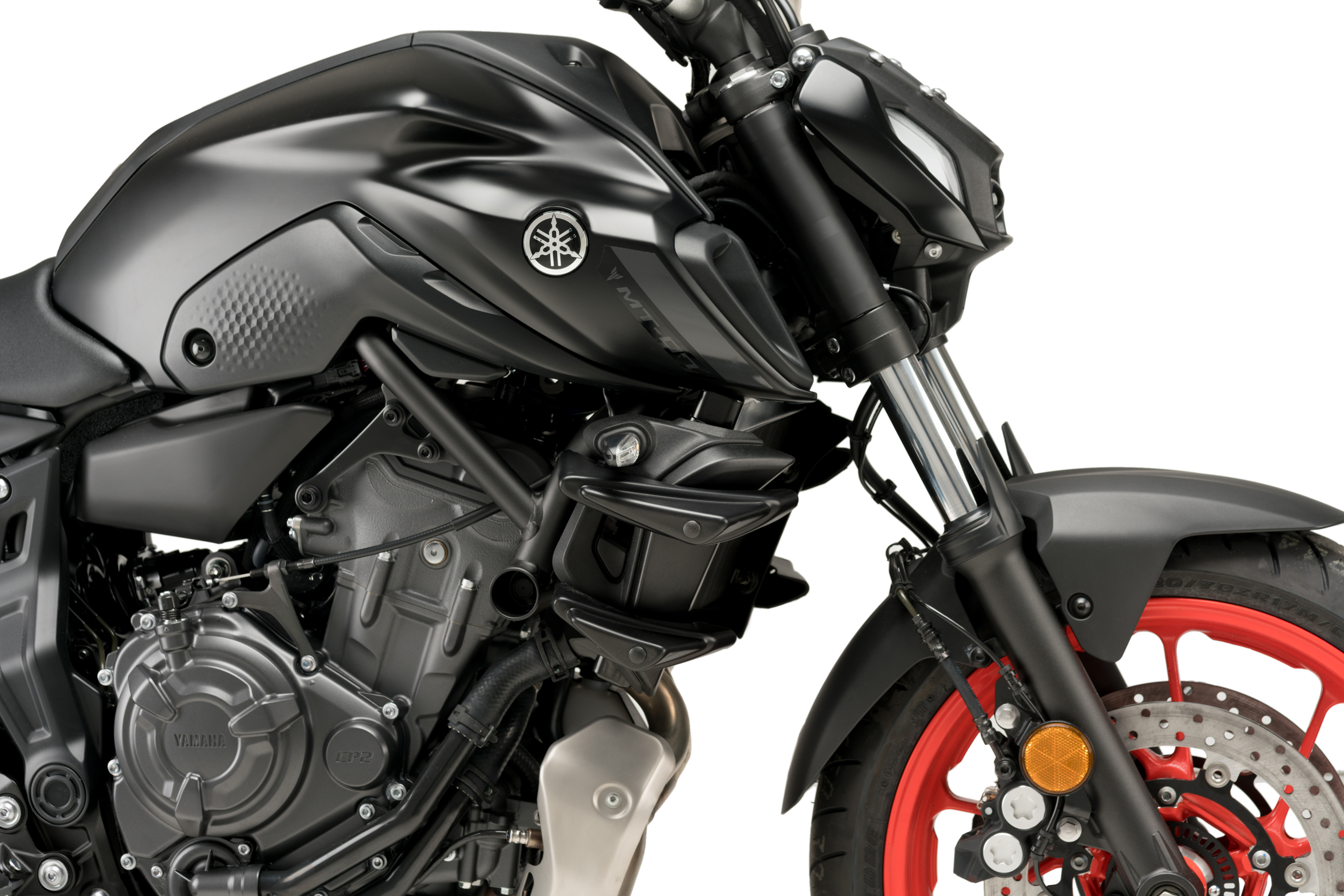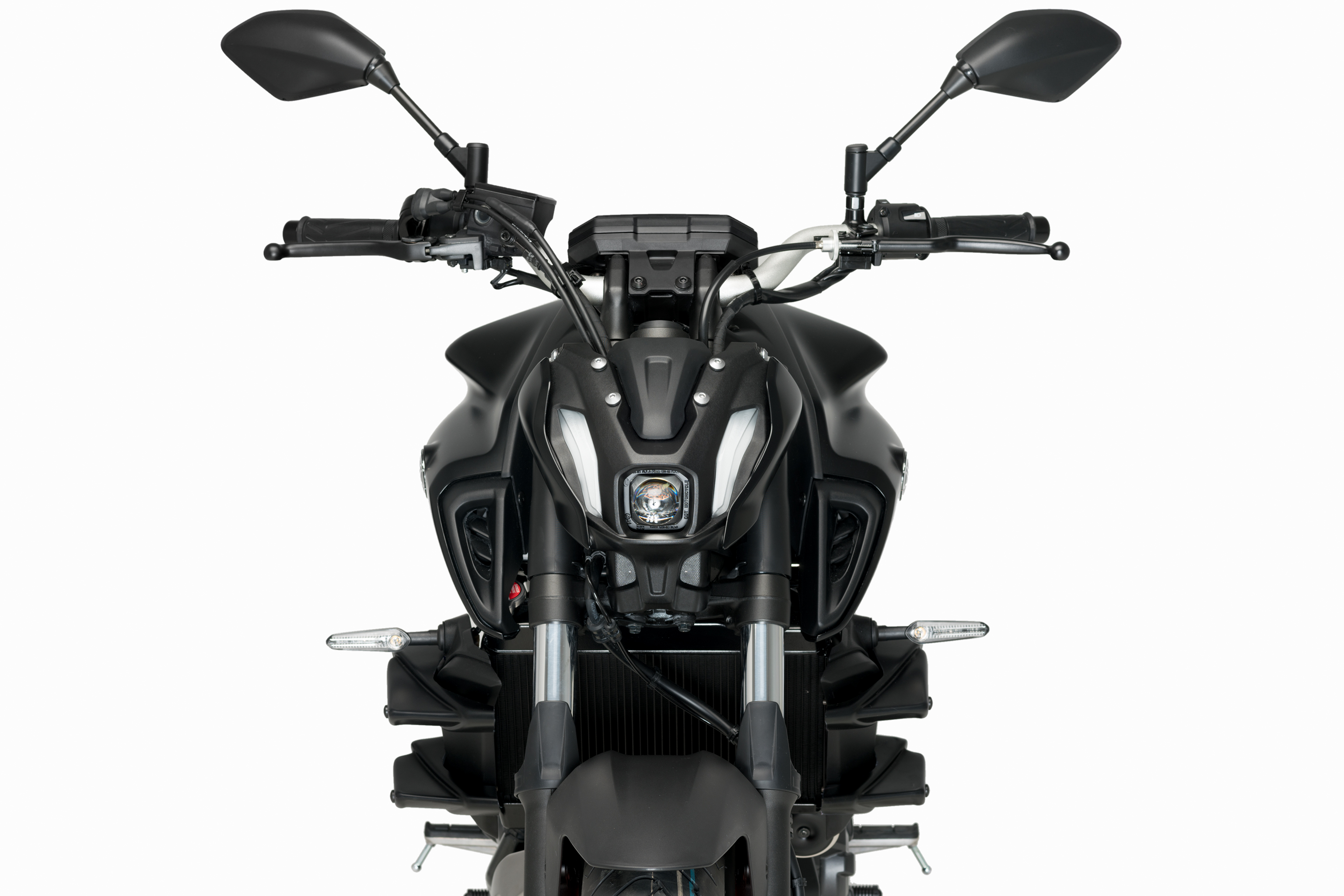 Der neue zweiteilige, tropfenförmige, mattschwarze Spoiler wurde sorgfältig entwickelt, um die Aerodynamik Ihrer MT-07 zu verbessern. Er passt sich perfekt an den Kühler an, wirkt wie ein Spoiler und sorgt für einen "Downforce"-Effekt an der Vorderachse. Das gibt Ihnen mehr Halt und Sicherheit beim Bremsen.