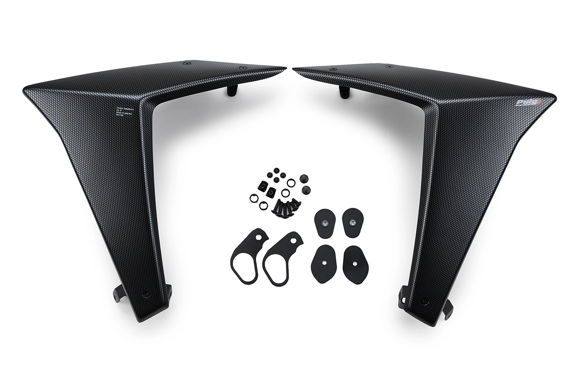 Sie bestehen aus hochwertigem ABS, erhältlich in mattschwarz oder Carbon-Look, und passen sich perfekt an das Fahrgestell des Motorrads an. Inklusive 2 mm Metallhalterungen mit schwarzer, strukturierter Korrosionsschutzbeschichtung.