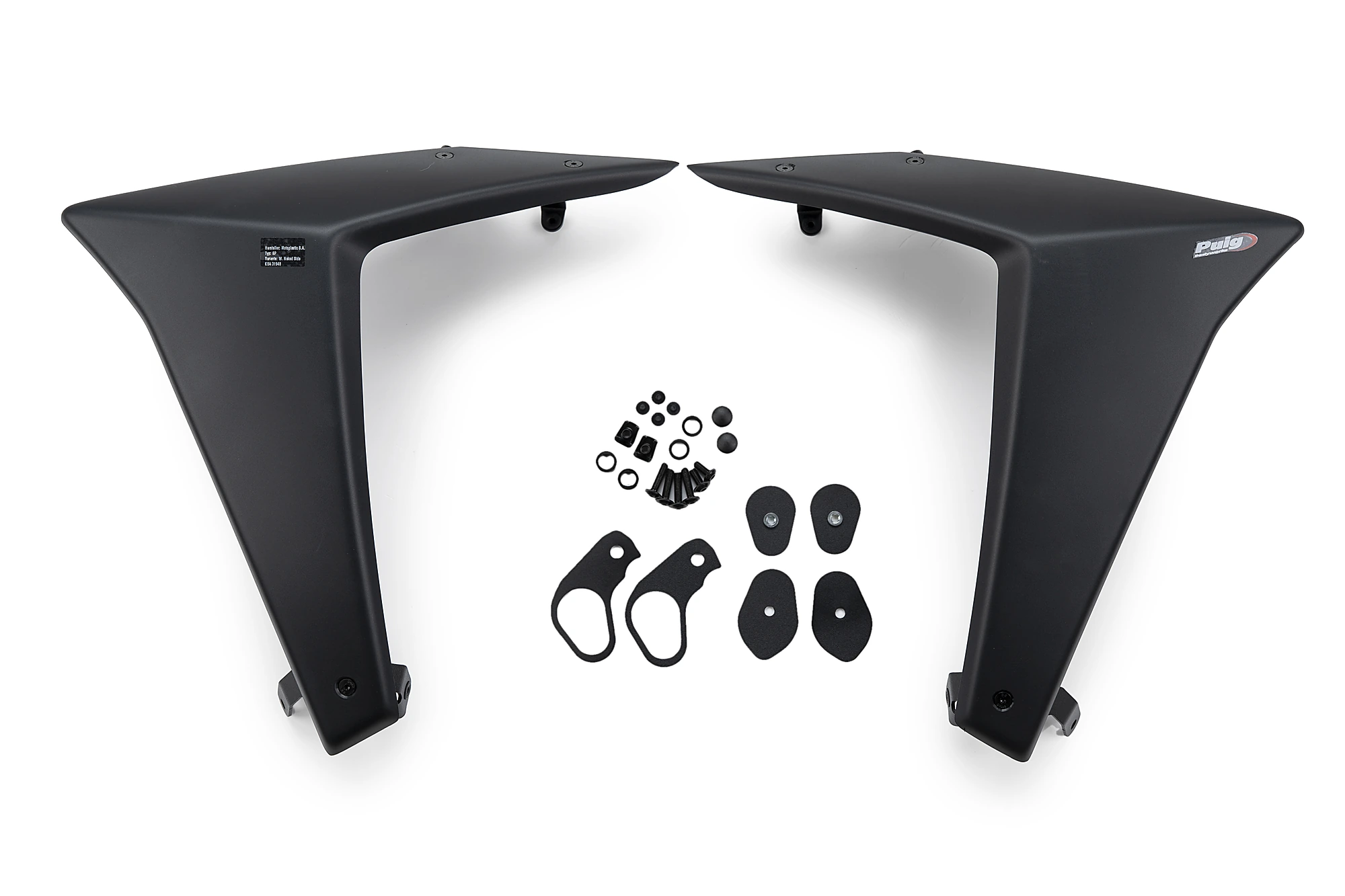 Ihr aggressives und minimalistisches Design fügt sich perfekt in die Linien der neuen MT-09 ein und vergrößert optisch die Frontpartie der Maschine dank der oberen Fläche, die maximalen Abtrieb erzeugt. Zudem verbinden sie harmonisch den Tank mit dem Kühler für eine sportlichere Rennoptik.