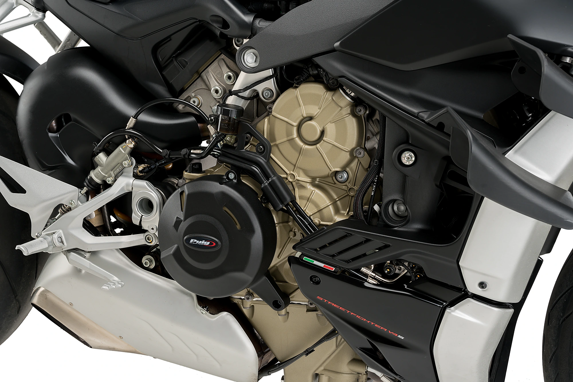 Um die Ästhetik des Motorrads zu erhalten, ist die Schutzabdeckung in matt gehalten und wird am Motorrad befestigt, indem sie auf es das Motorgehäuse schrauben.