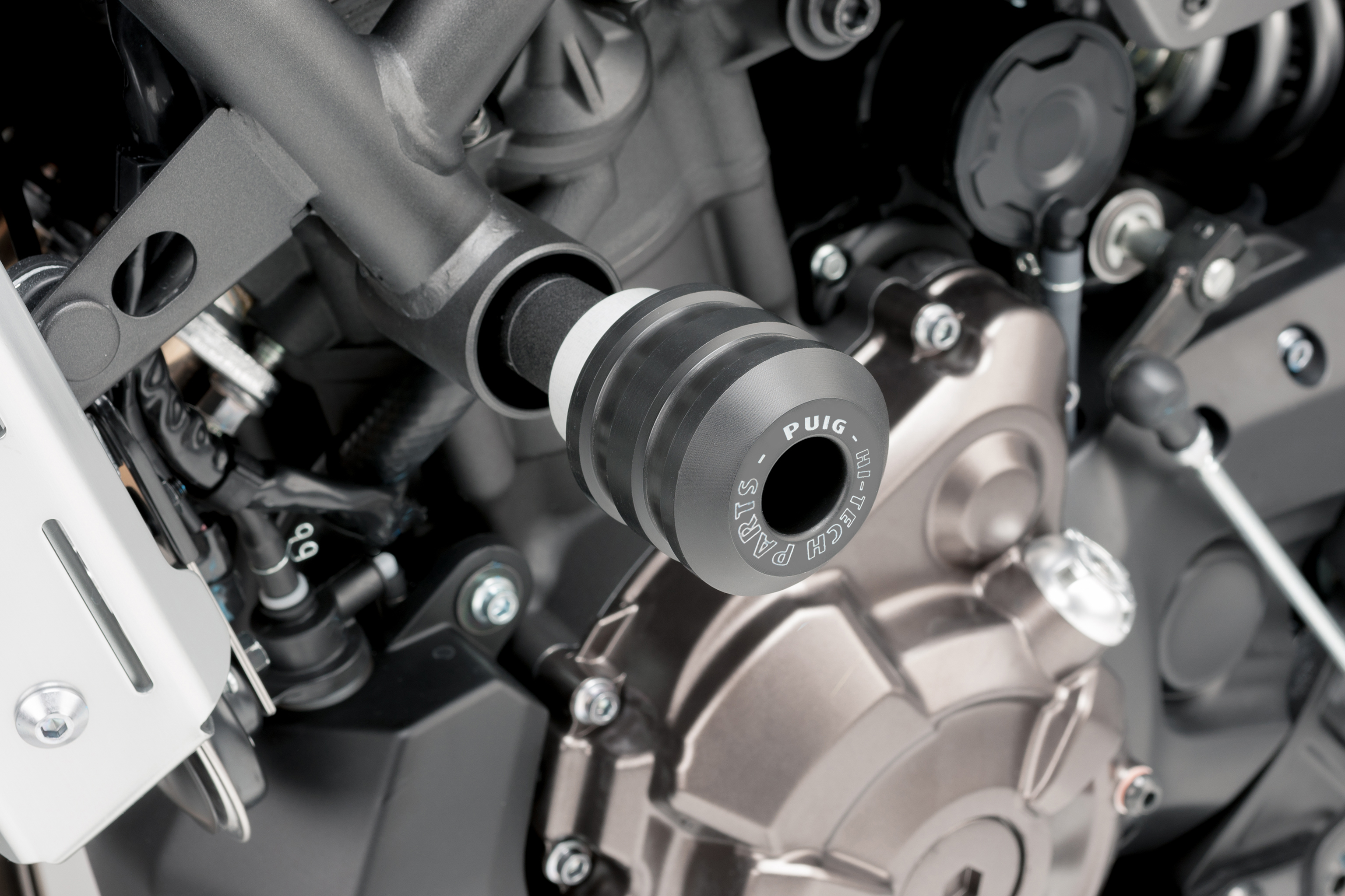 Die Sturtzpads, die das Motorrad nicht verbreitern, da sie nicht über den Lenker hinausragen, dienen nicht nur zum Schutz des Motors sondern auch dem Schutz vom Rahmen des Bikes. Falls es zu einem Sturtz kommen sollte, berühren die Fußrasten zuerst den Boden, bevor die Sturtzpads ihnen folgen.