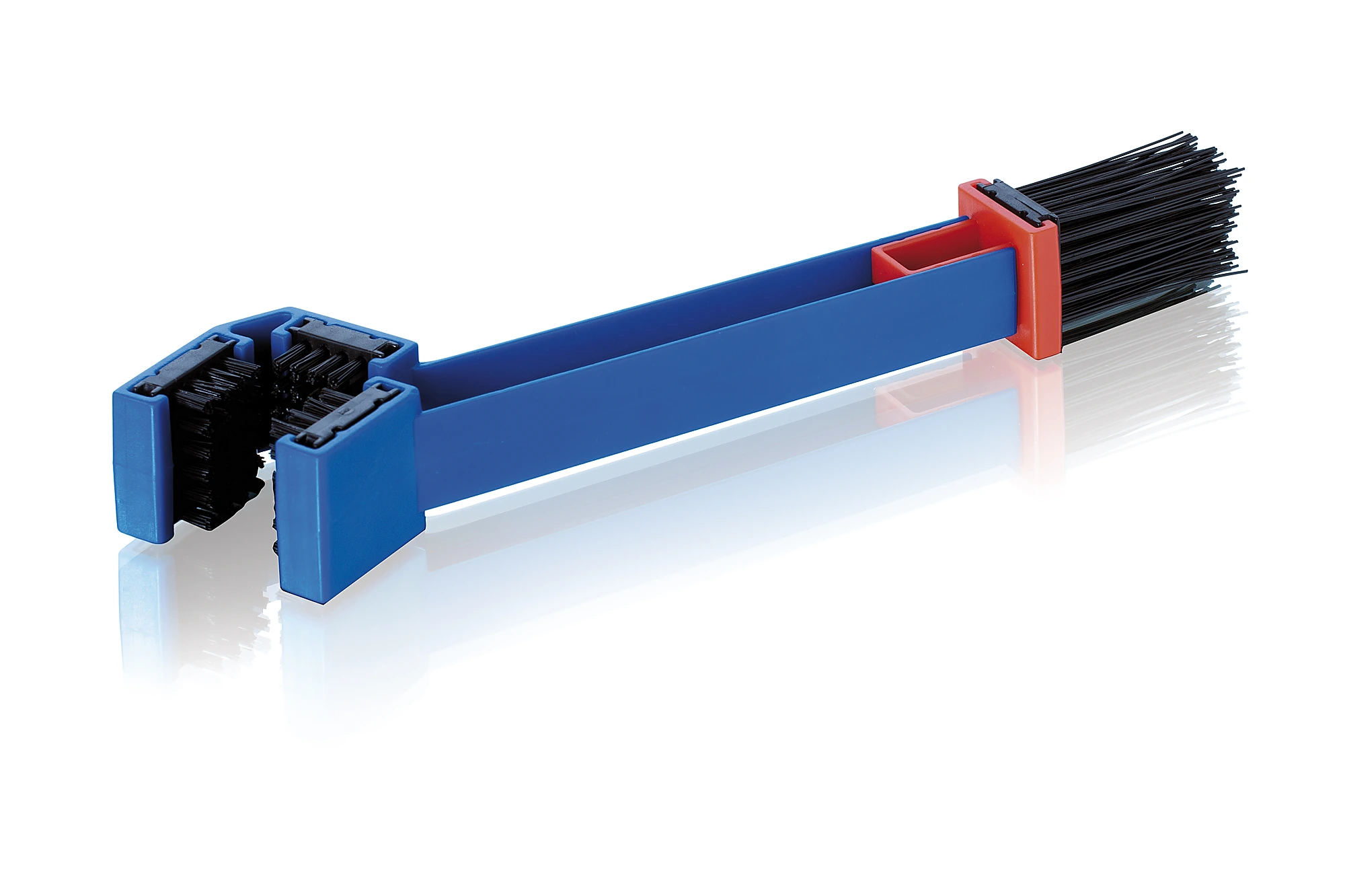 Die beiden Enden der Bürste haben Kunststoffborsten von hohem Widerstand, austauschbar und von variabler Härte. Die eine Seite passt sich der Kontur der Kette an und mit ihren kurzen und starken Borsten lässt sich der in der gesamten Kontur der Kette eingebettete Schmutz leicht entfernen, während die andere Seite, länger und weicher, den heruntergefallenen Schmutz entfernen muss auf der Felge, der Schwinge oder dem Bremssattel.