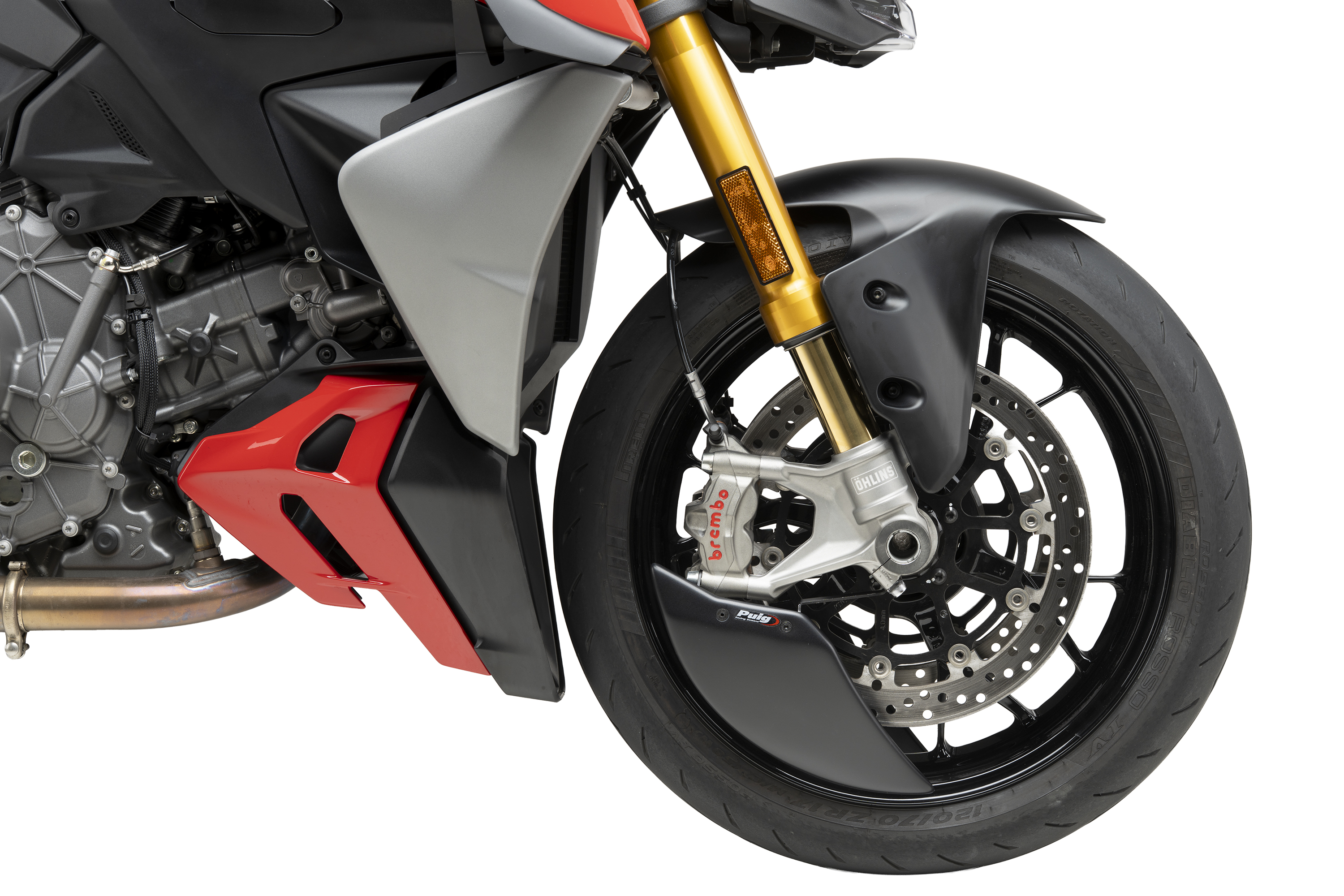 Its main function is to reduce the turbulence generated around the front wheel, providing greater stability and precision, especially at high speeds or under demanding riding conditions. Thanks to this effect, the motorcycle offers more predictable handling and superior comfort for the rider.