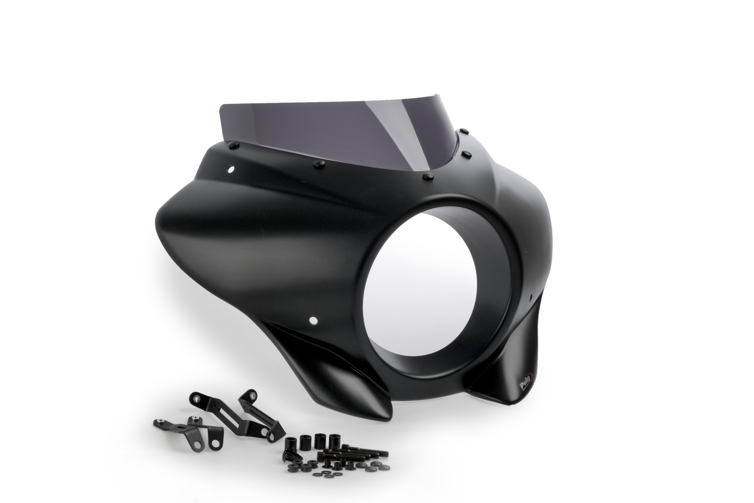 The Mirage semi-fairing is a very universal accessory since its design easily adapts to motorcycles with a round headlight, covering the front part around the headlight, protecting it from dirt and small impacts.
