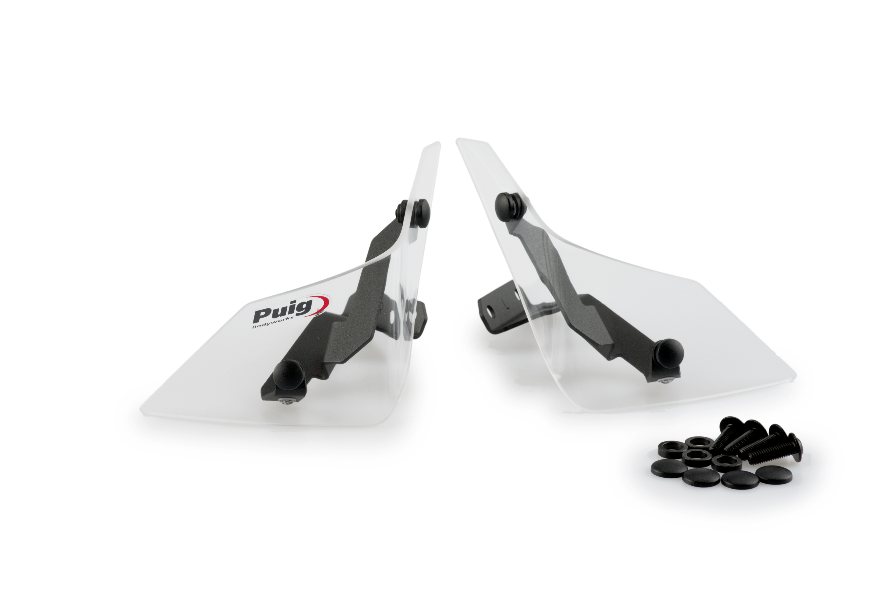 The deflectors are compatible with the original Puig handguards and handguard extensions, as well as all Puig screens for this model.Its shape and placement are carefully designed to divert air from the upper area of the rider’s arms and shoulders, areas that are normally unprotected and that generate long muscular fatigue in long drives.