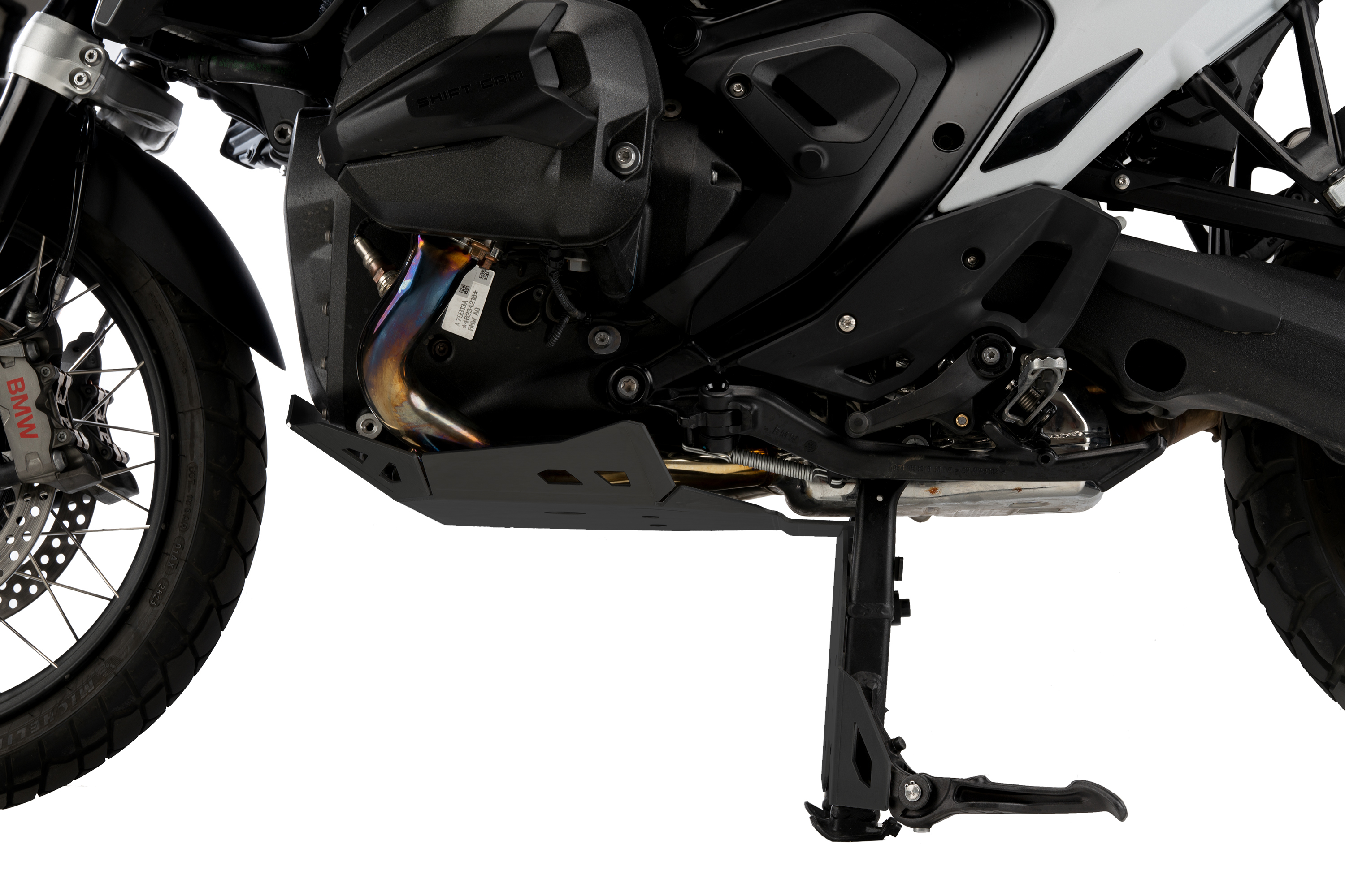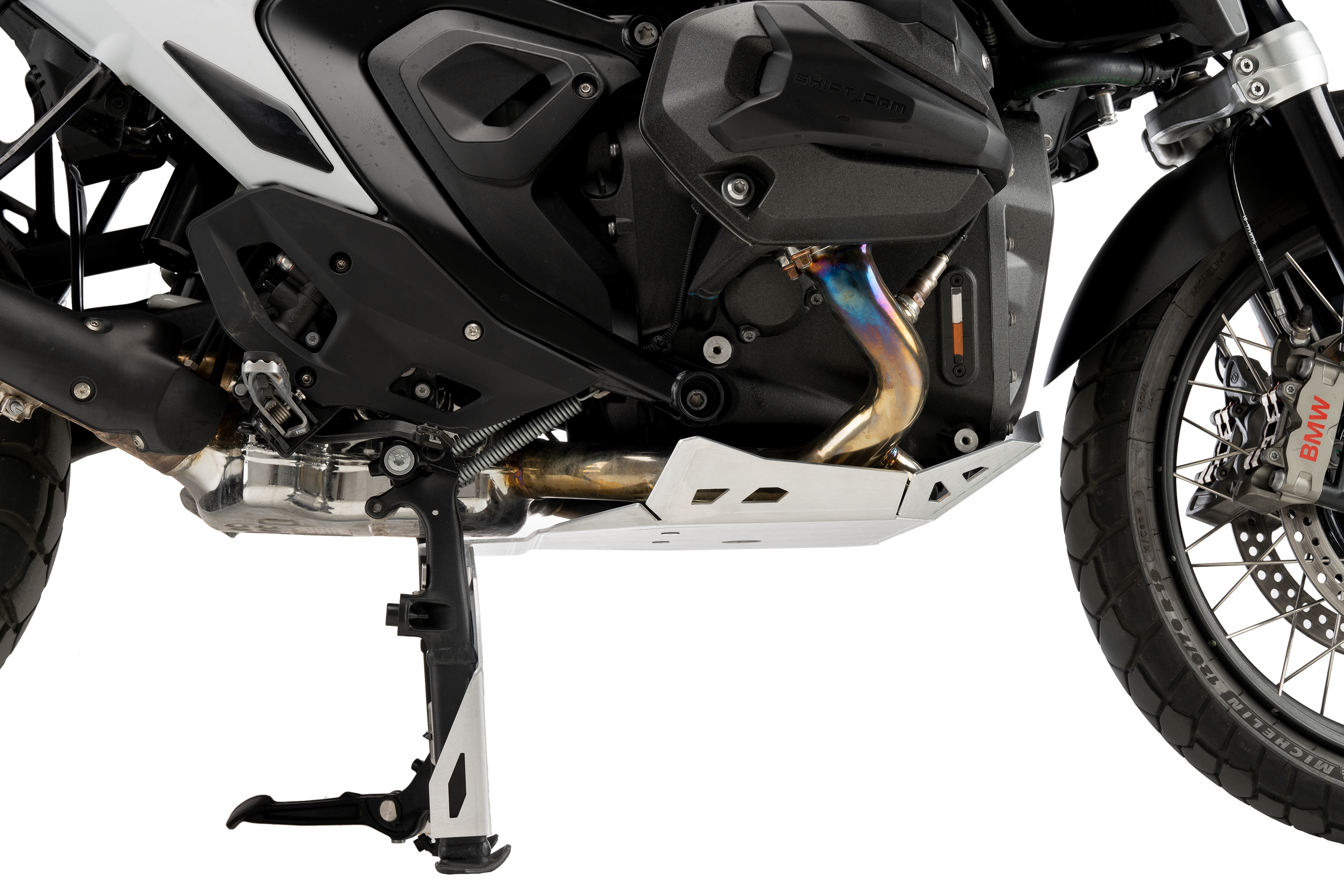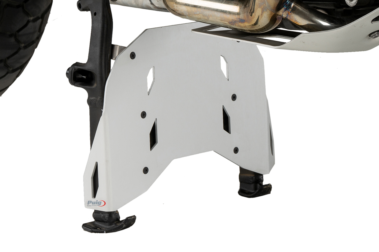 This center stand protector plate is the perfect combination of functionality and design. Made of high-grade 4 mm thick aluminum and available in either matte silver anodized or textured black paint finish, it provides extra protection against elements and common off-road impacts: rocks, mud, sand, or direct hits.