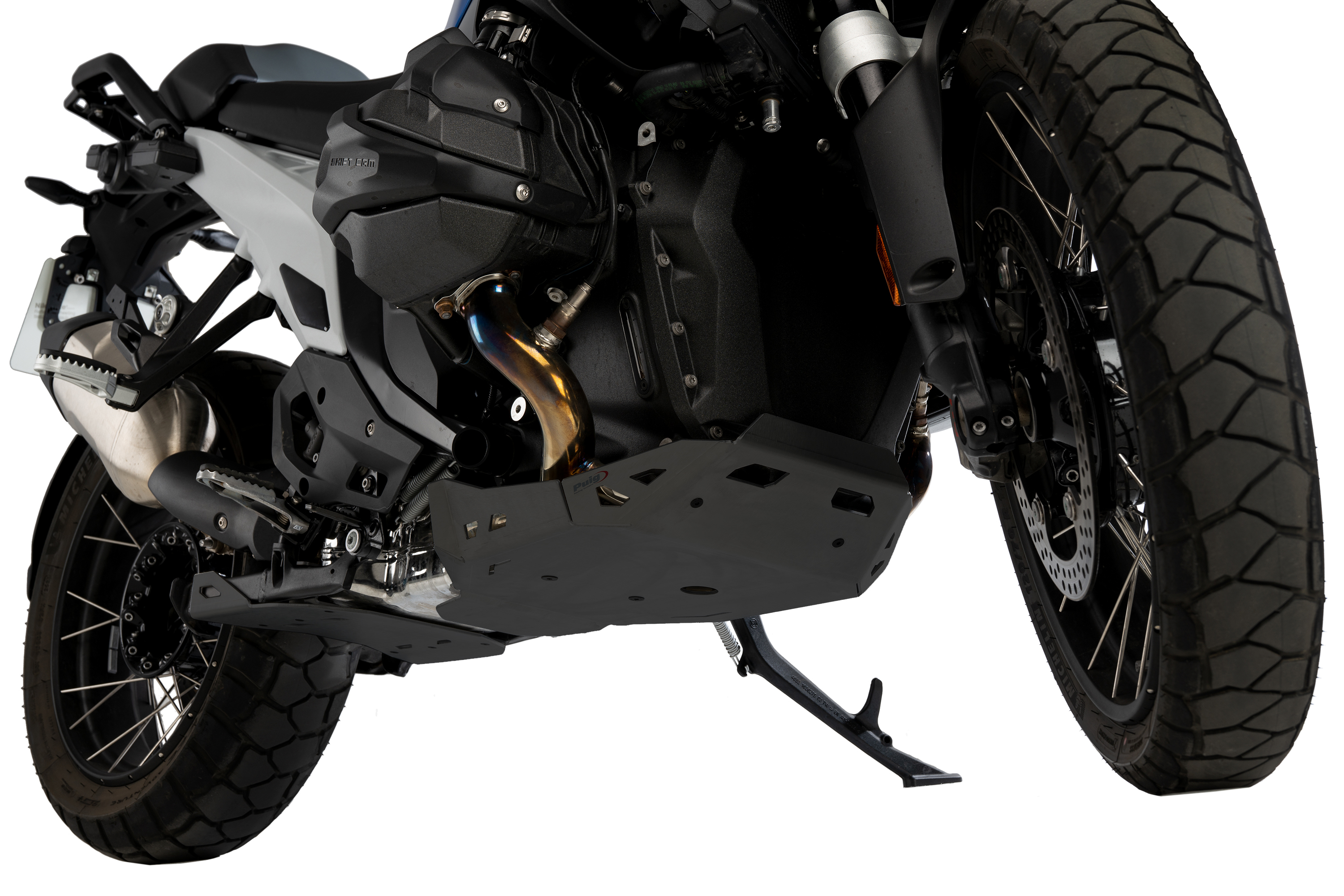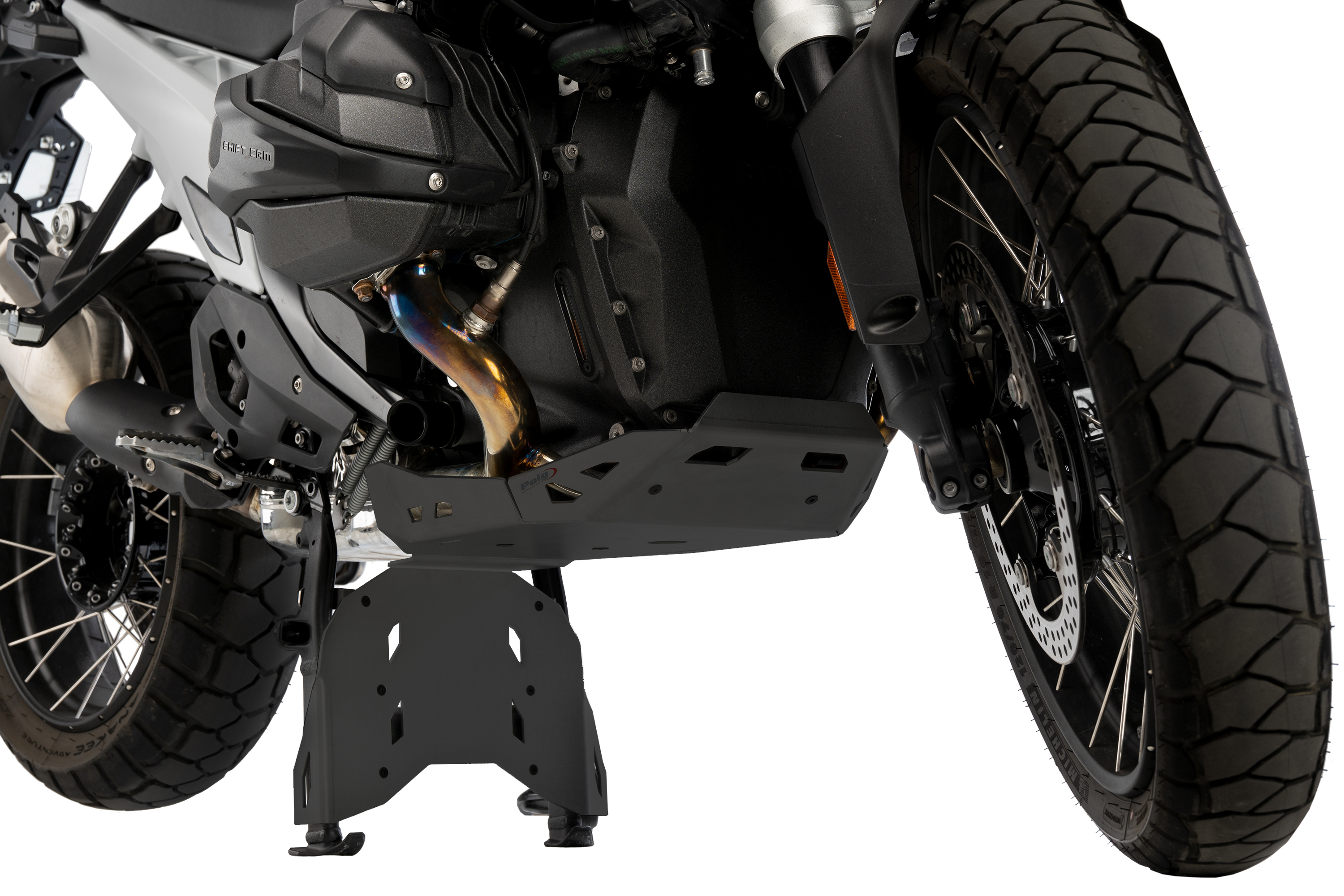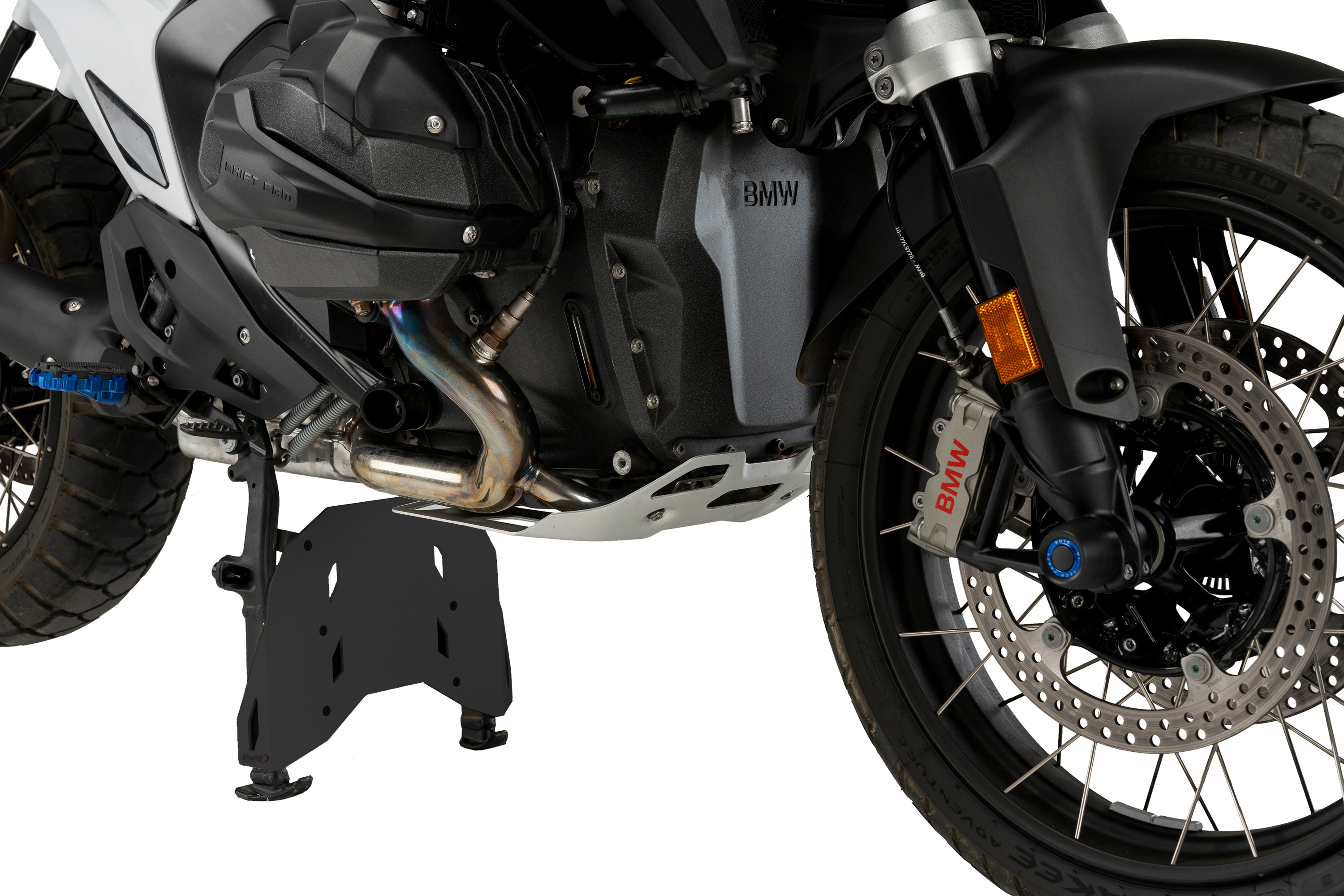 This center stand protector plate is the perfect combination of functionality and design. Made of high-grade 4 mm thick aluminum and available in either matte silver anodized or textured black paint finish, it provides extra protection against elements and common off-road impacts: rocks, mud, sand, or direct hits.