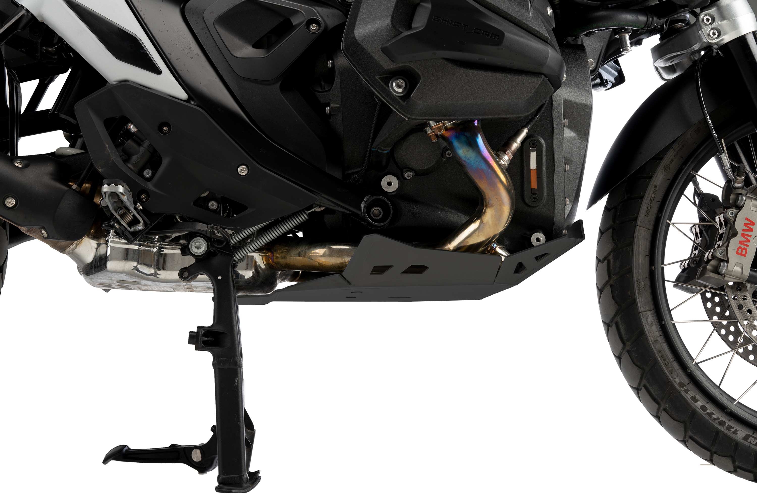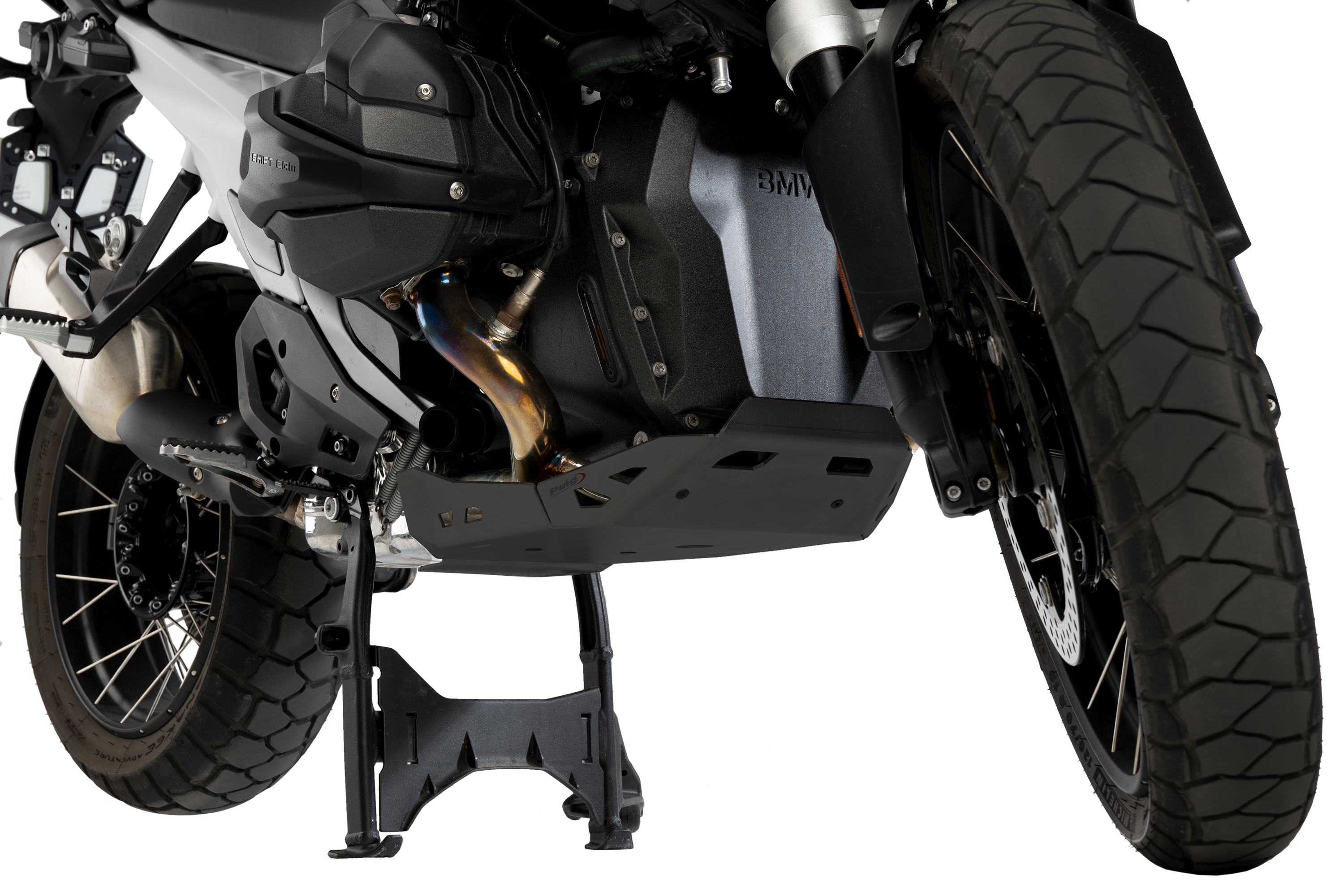 Increase the protection of the lower area of the BMW R1300GS, including the engine casing, exhaust headers, catalytic converter, and central stand with Puig's engine protector extension.