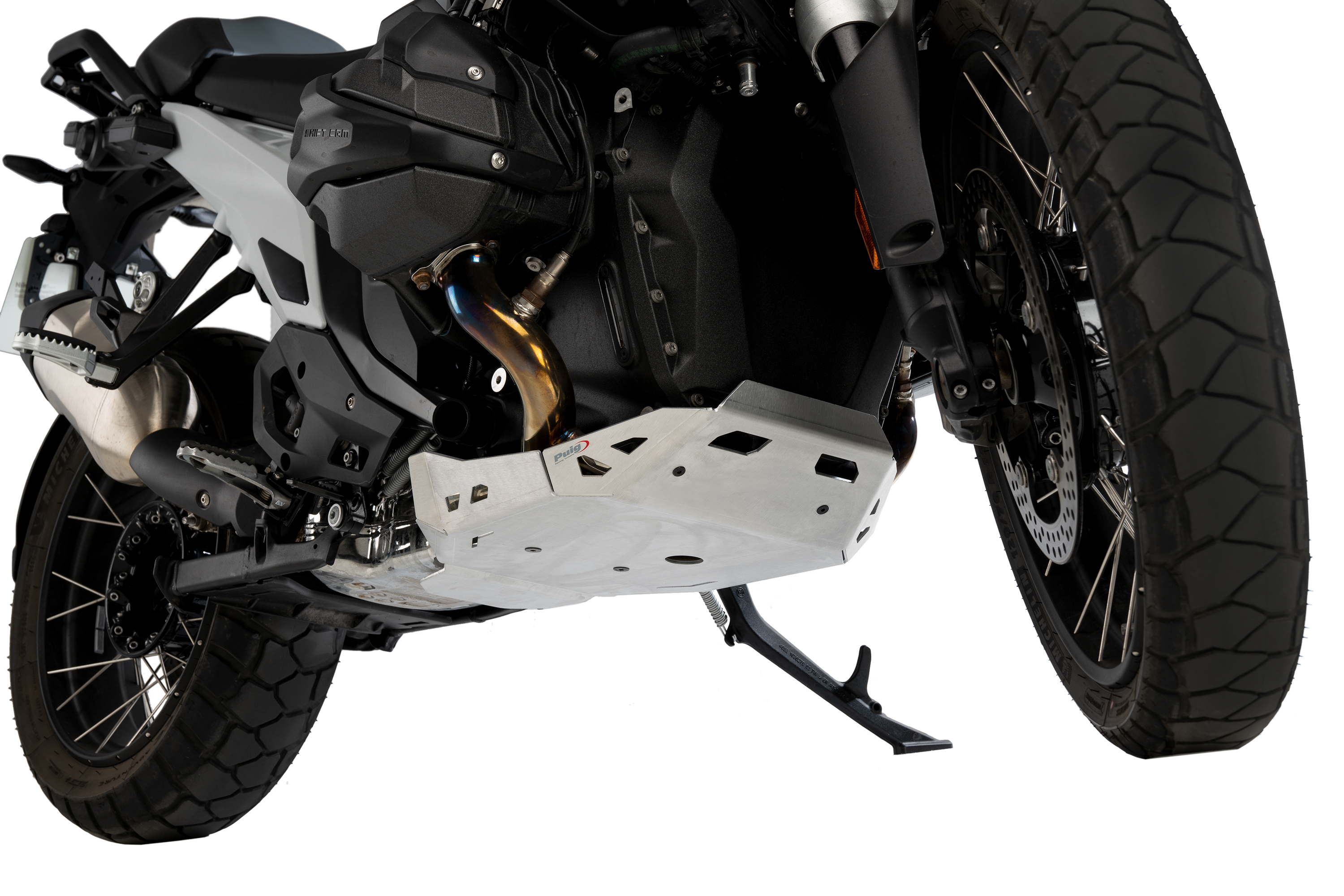 Specifically designed for the new version of the German maxitrail, it fits perfectly onto the motorcycle's central stand, enhancing protection of the exhaust pipe and complementing Puig's engine casing protector (Ref.21829).