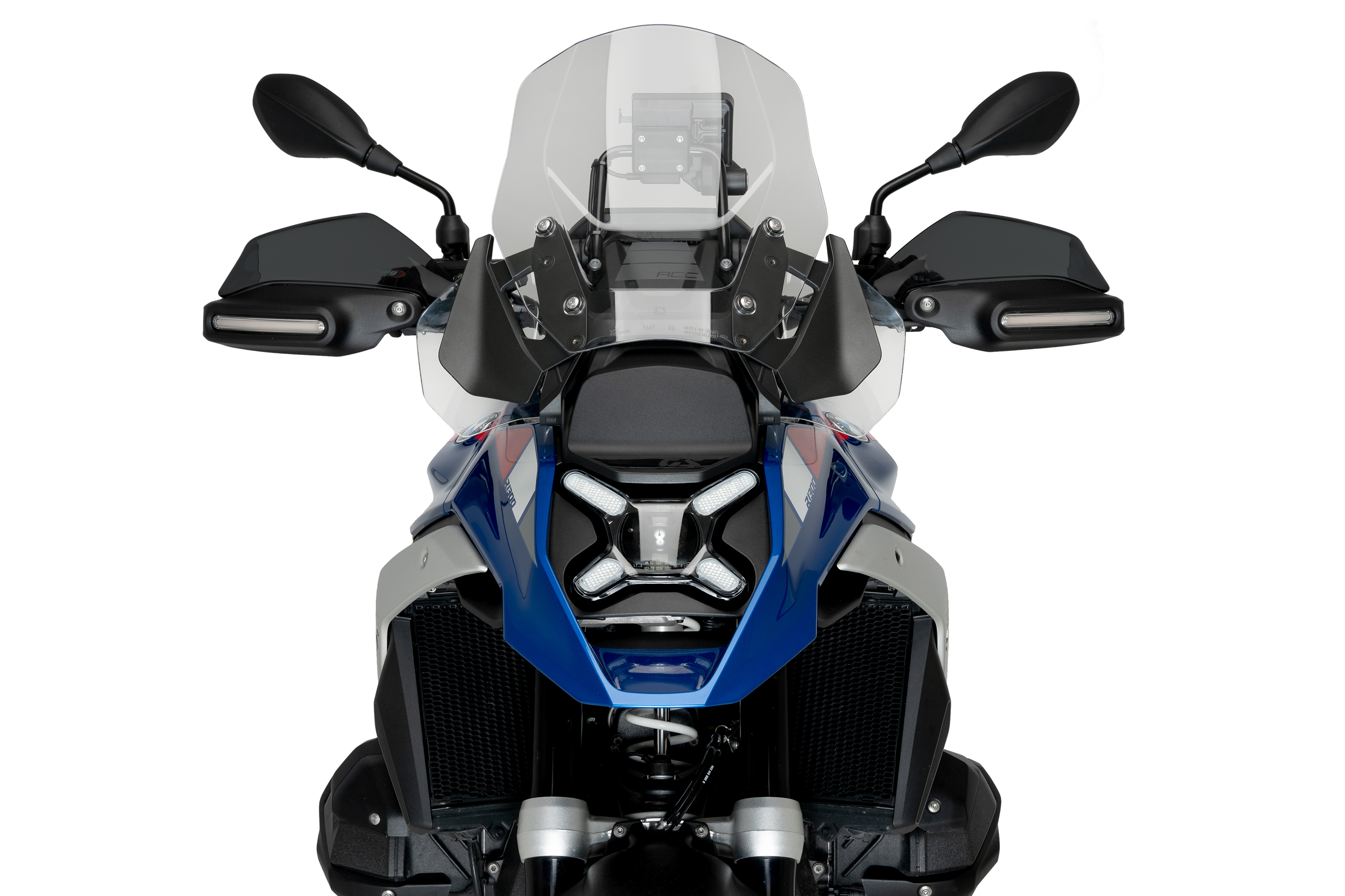 Its total dimensions are 275mm wide by 130mm high. Puig's handguard extension is compatible with both the original BMW windshield and the Puig windshield.