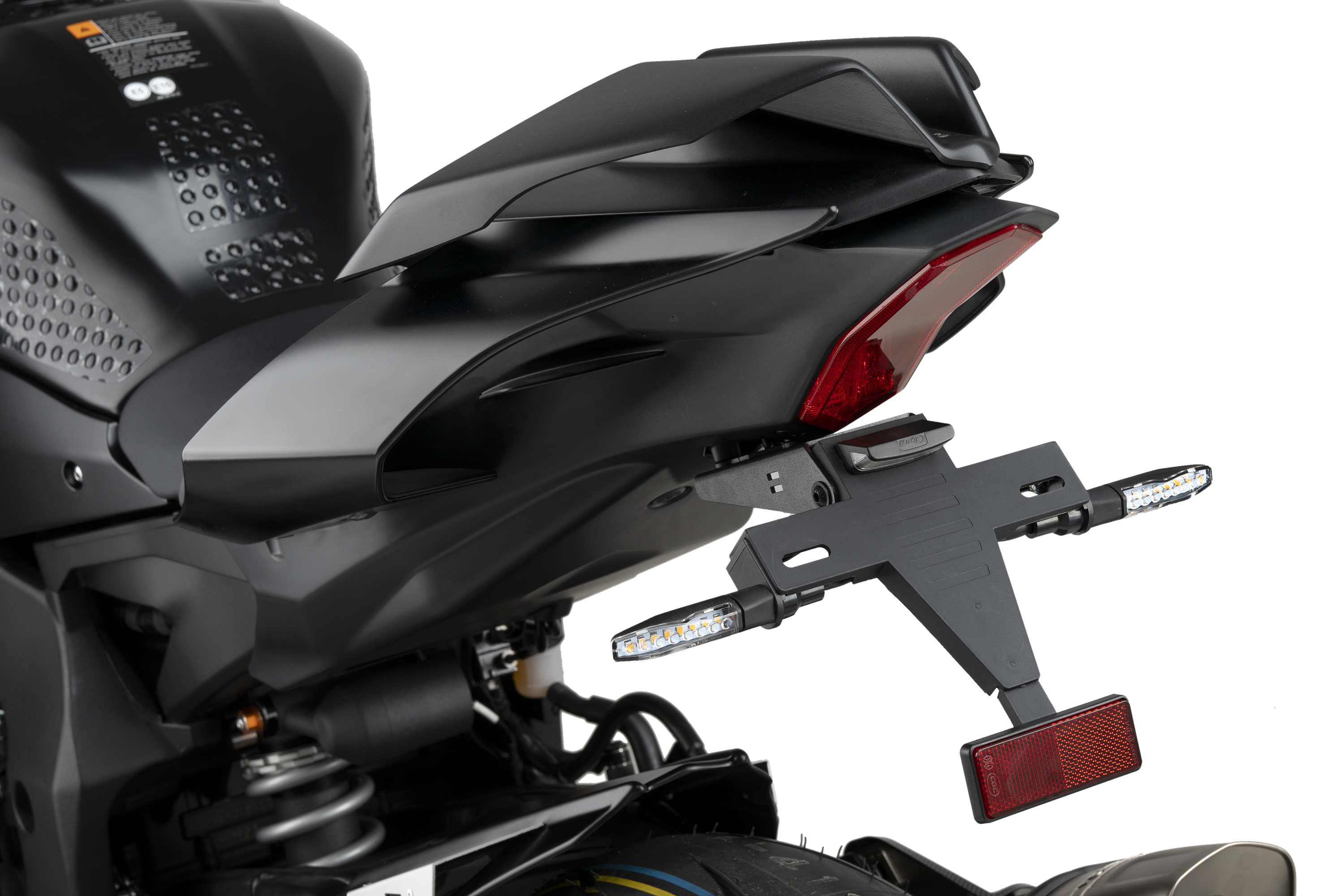 Replace your motorcycle's original license plate holder with the Puig license plate support, which, thanks to its elevated position, provides a sporty look to your bike. The set combines steel parts with an epoxy-painted finish and polyamide elements, achieving a significant weight reduction compared to the original holder.
