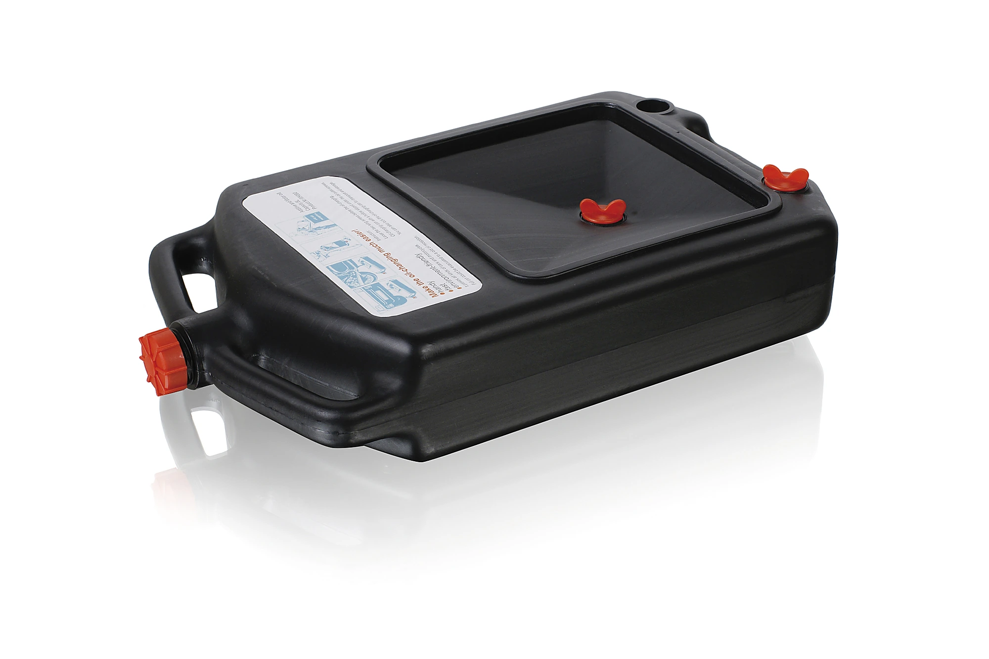 The surface of the container has been designed with a funnel-like shape to facilitate the operation. In addition to the large drain hole, it has two ergonomic red contrast plugs, one for filling and another to facilitate the exit of air from inside during the process.