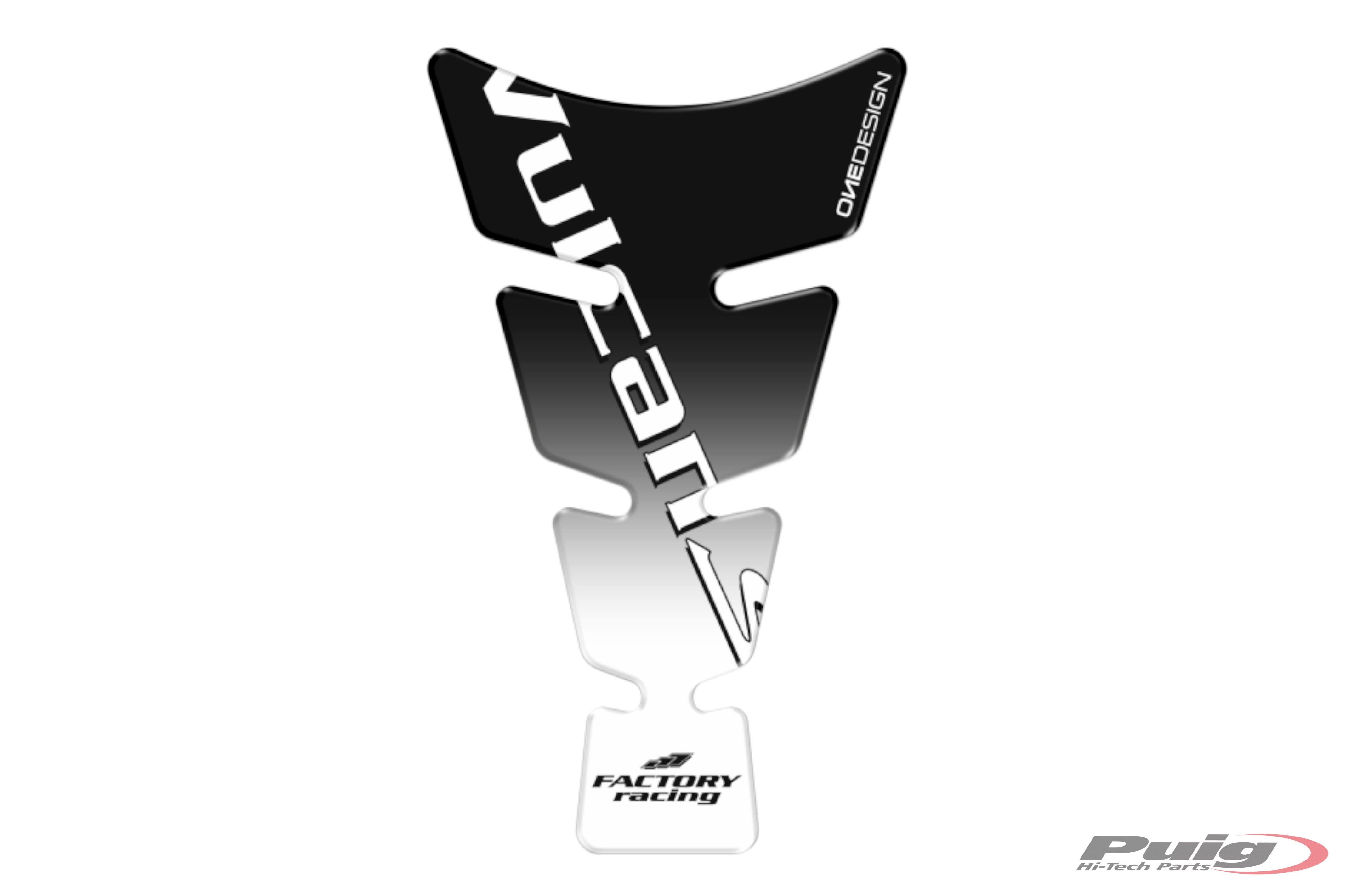 Tank pad with a standard form featuring the motorcycle model in the central section, either black or silver depending on the color of bike tank. We have two colors: black and silver.