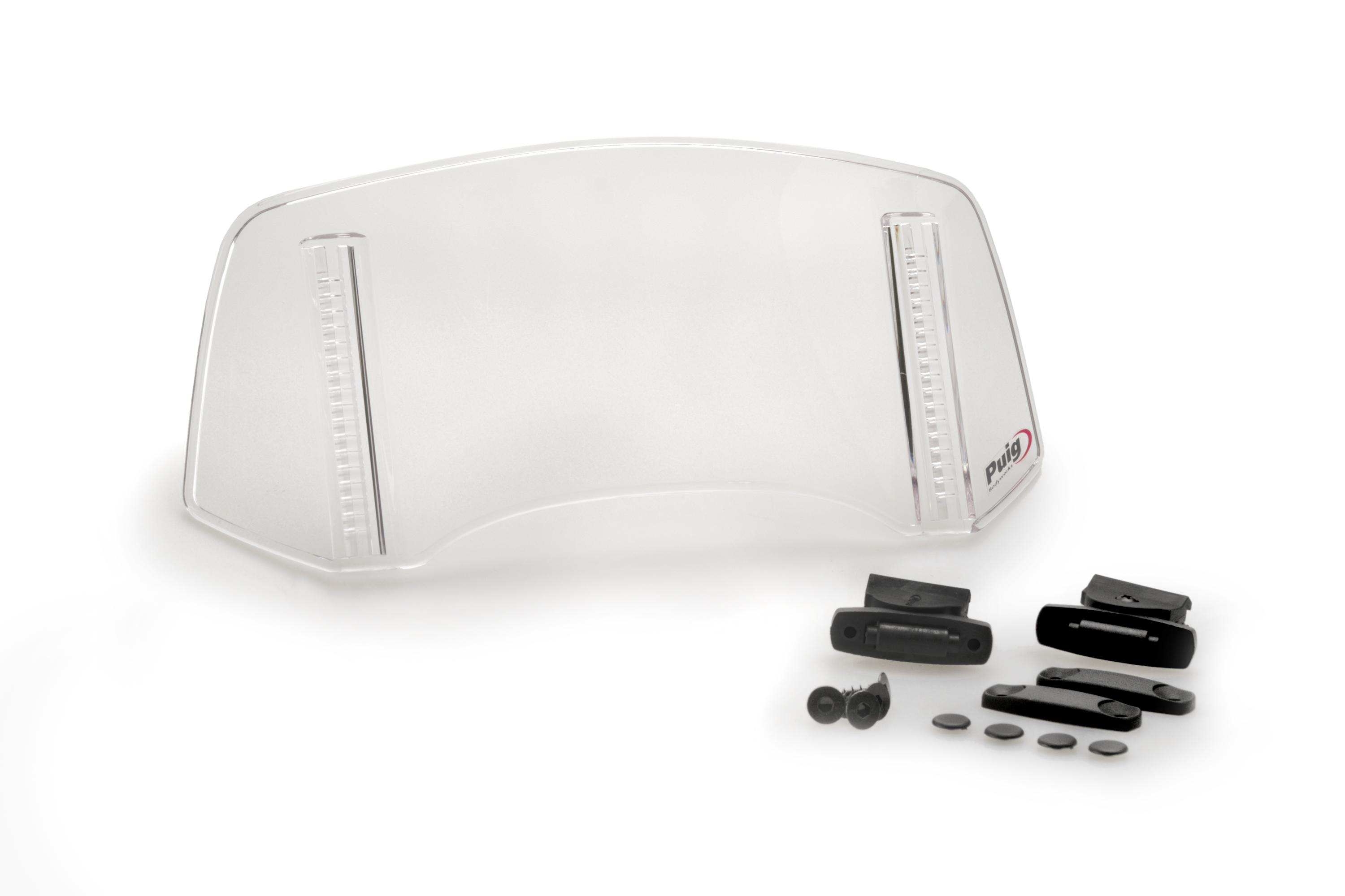 Its special design and measurements (300mm wide and 130mm high) are optimal for acting as a screen against gusts of wind, diverting it from sensitive areas such as the rider's helmet and torso. In addition, it avoids possible turbulence and sounds that can disturb or distract while riding. The user will be able to adapt the visor in up to 4 rotation positions, which together with the guides that allow its height to be adjusted by 100, become infinite positions that allow it to be adjusted to your height or preferences.