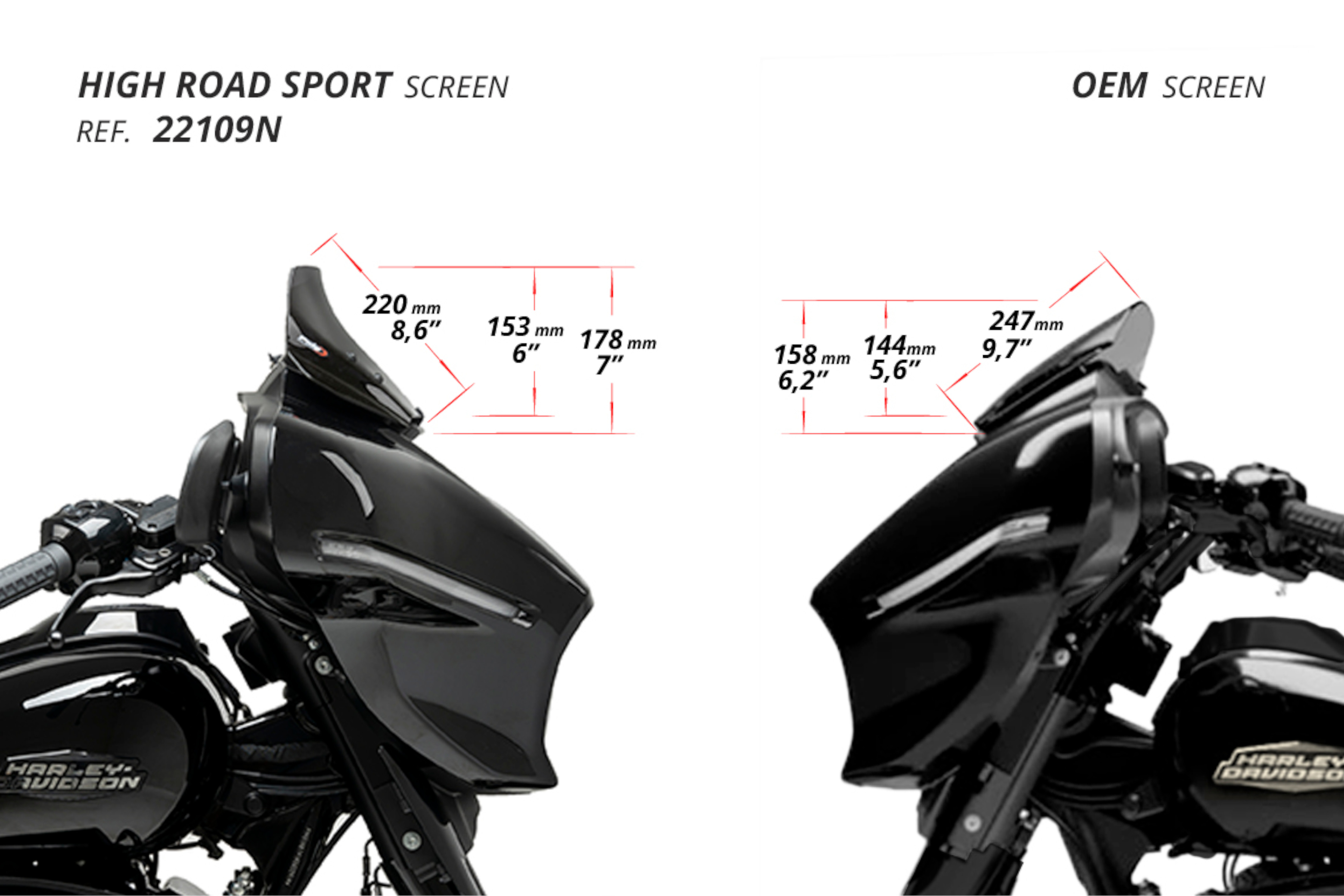 The dimensions of the Sport version are 600 mm wide by 220 mm high, making it 20 mm lower than Harley’s original windshield.