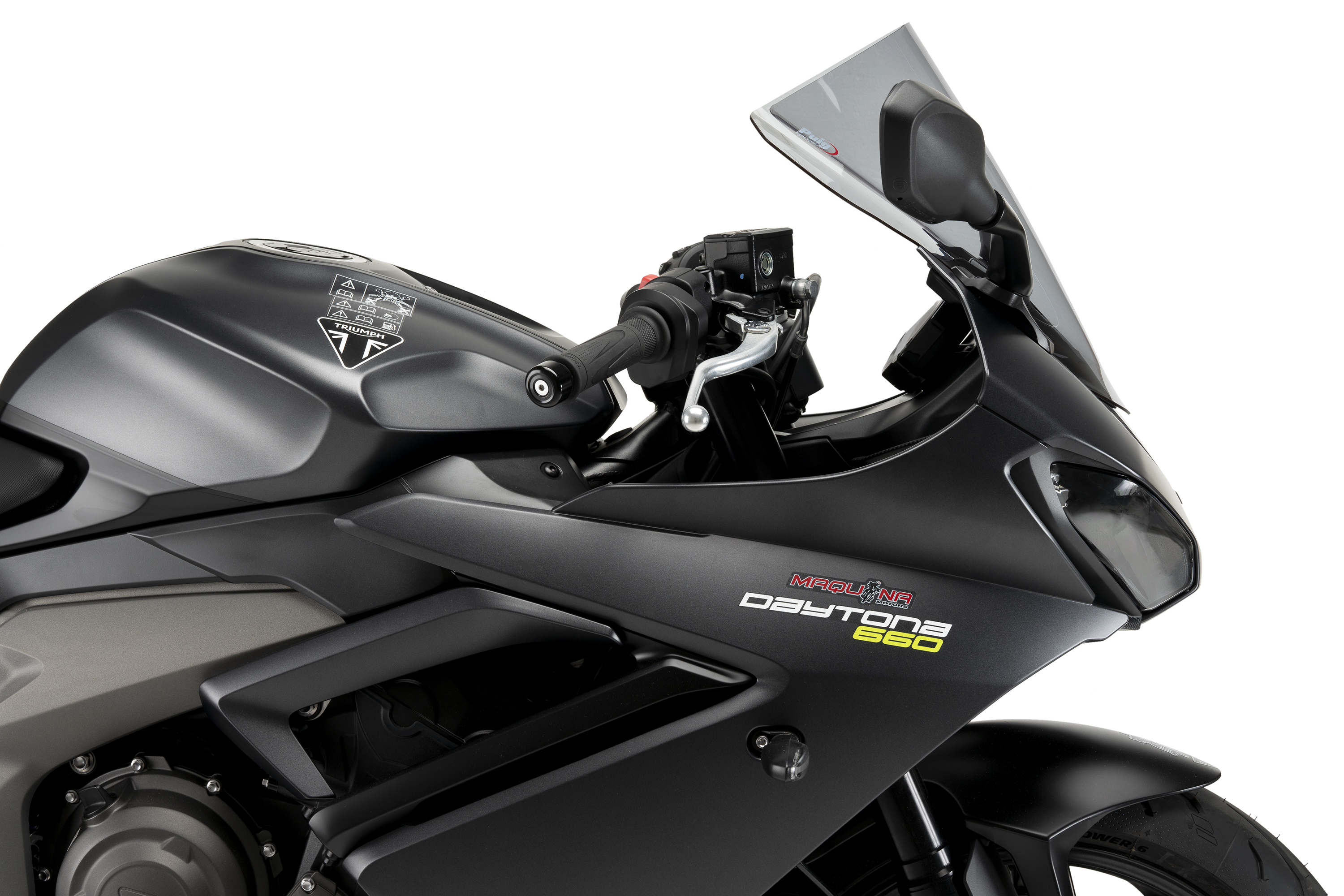 Its design, inspired by the fairings used in MotoGP and WorldSBK championships, maintains the original shape but increases the height to achieve better rider aerodynamics, while also providing an attractive, sporty, and personalized look for your TRIUMPH DAYTONA 660. This aerodynamic improvement will result in less helmet discomfort for the rider in high-speed areas, such as a track's straightaway.