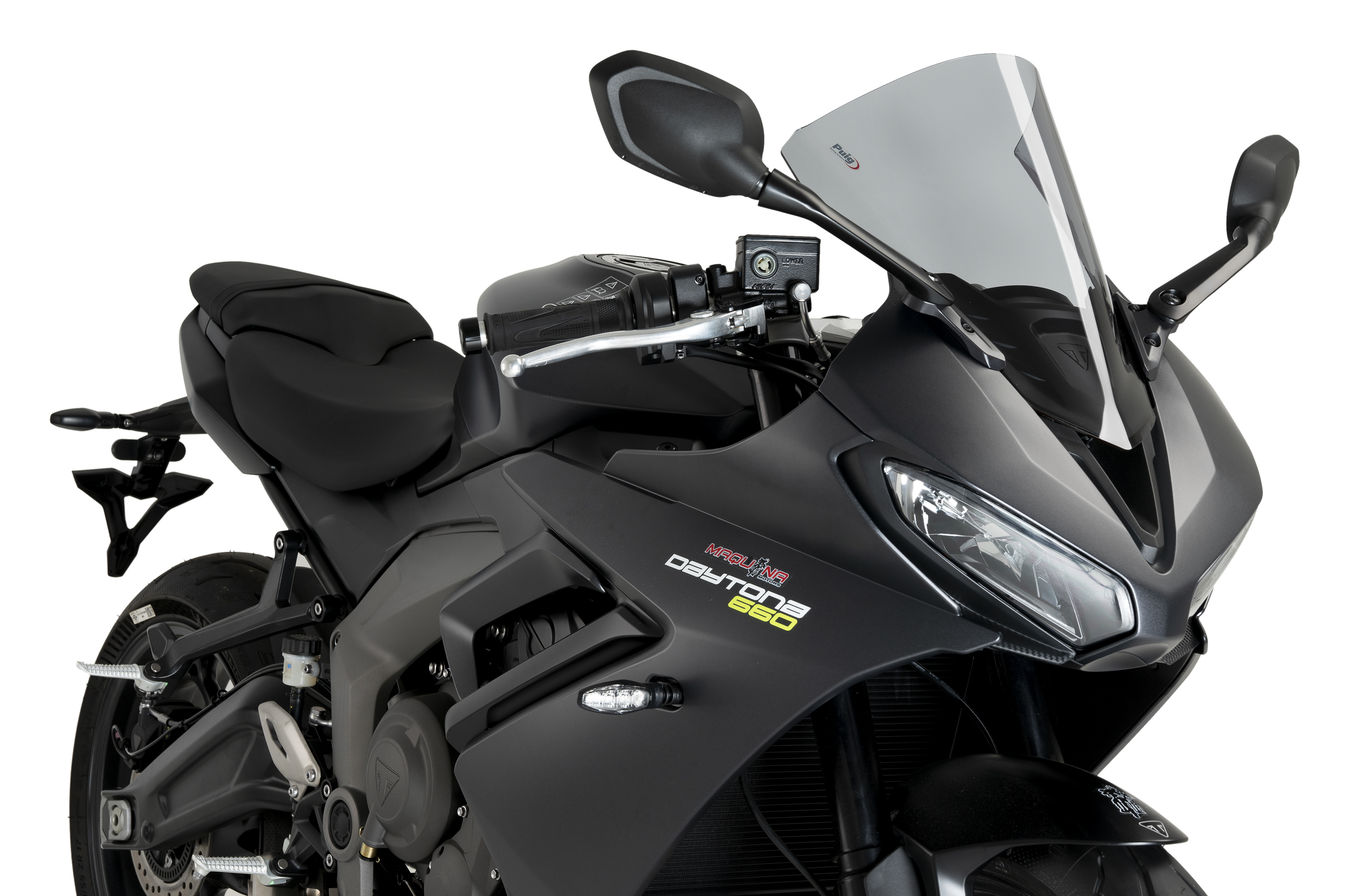 With dimensions of 310 mm wide by 395 mm high, the Puig R-Racer fairing is 70 mm taller than the original fairing of the Triumph Daytona 660.