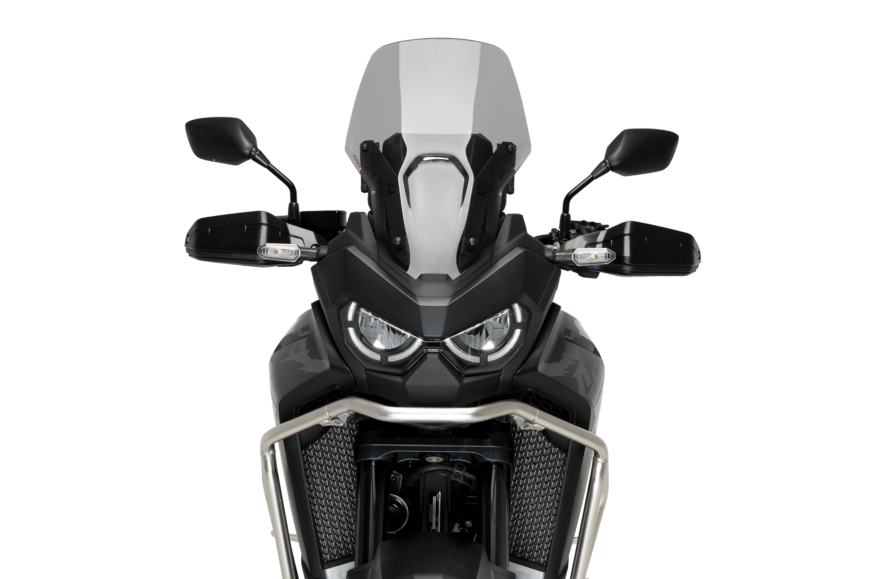 Designed specifically for the Honda Africa Twin Adventure Sports 20'-, the Puig Touring screen has larger dimensions compared to the original screen, and together with its studied shapes it increases the rider's aerodynamic protection and the sensation of comfort when diverting effectively the air that would impact against the rider, avoiding annoying noises and turbulence. At the same time it offers a clear field of vision, making it optimal for long trips, tall riders or riding in adverse weather conditions.