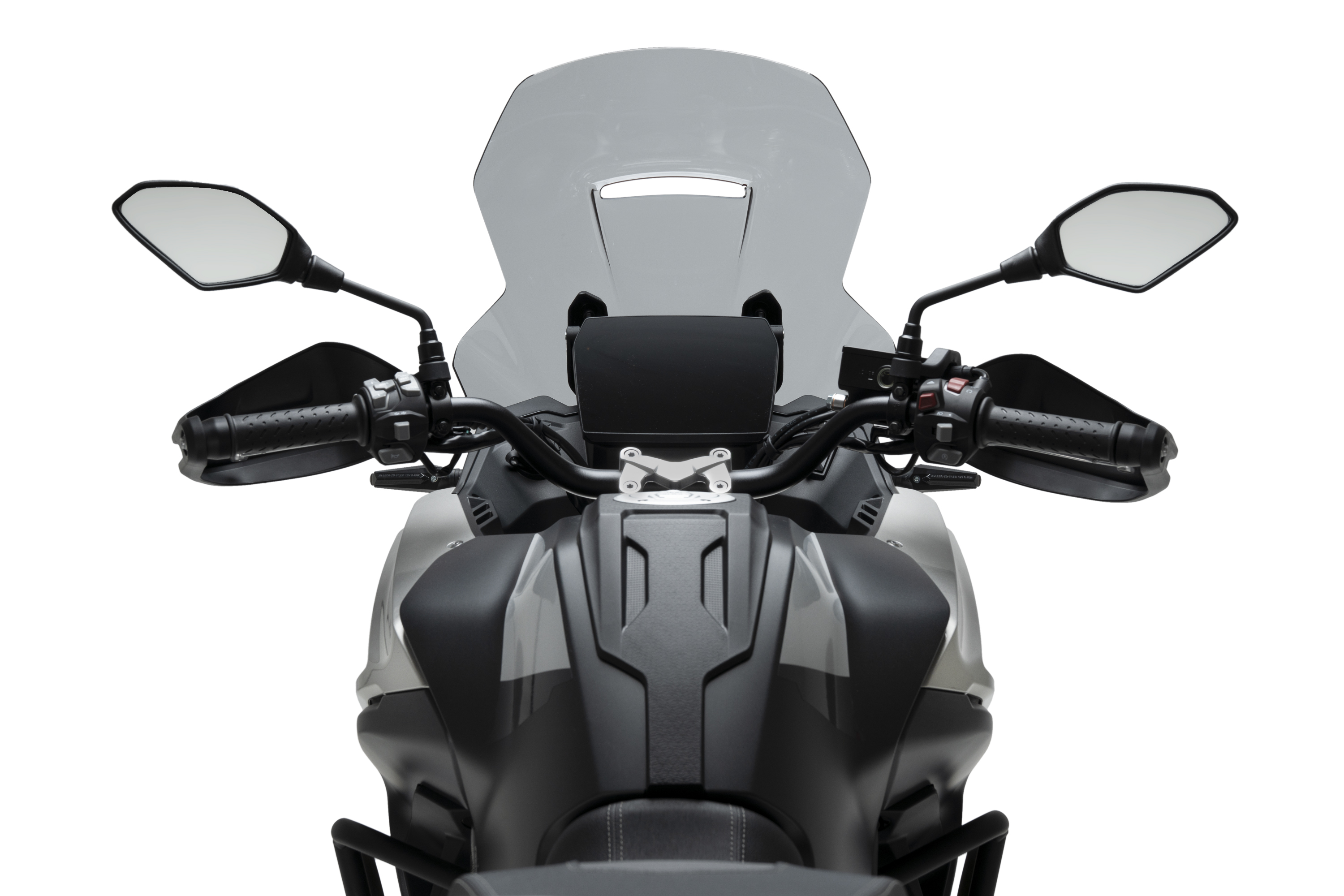 The new Puig Touring Windshield for the 2024 Voge DSX 525 is designed to provide superior aerodynamic protection without compromising aesthetics or functionality. Thanks to its flat central upper area, it ensures excellent visibility through the screen, while the lower side shapes act as deflectors, channeling the air that would directly impact the rider’s hands, increasing comfort while riding.