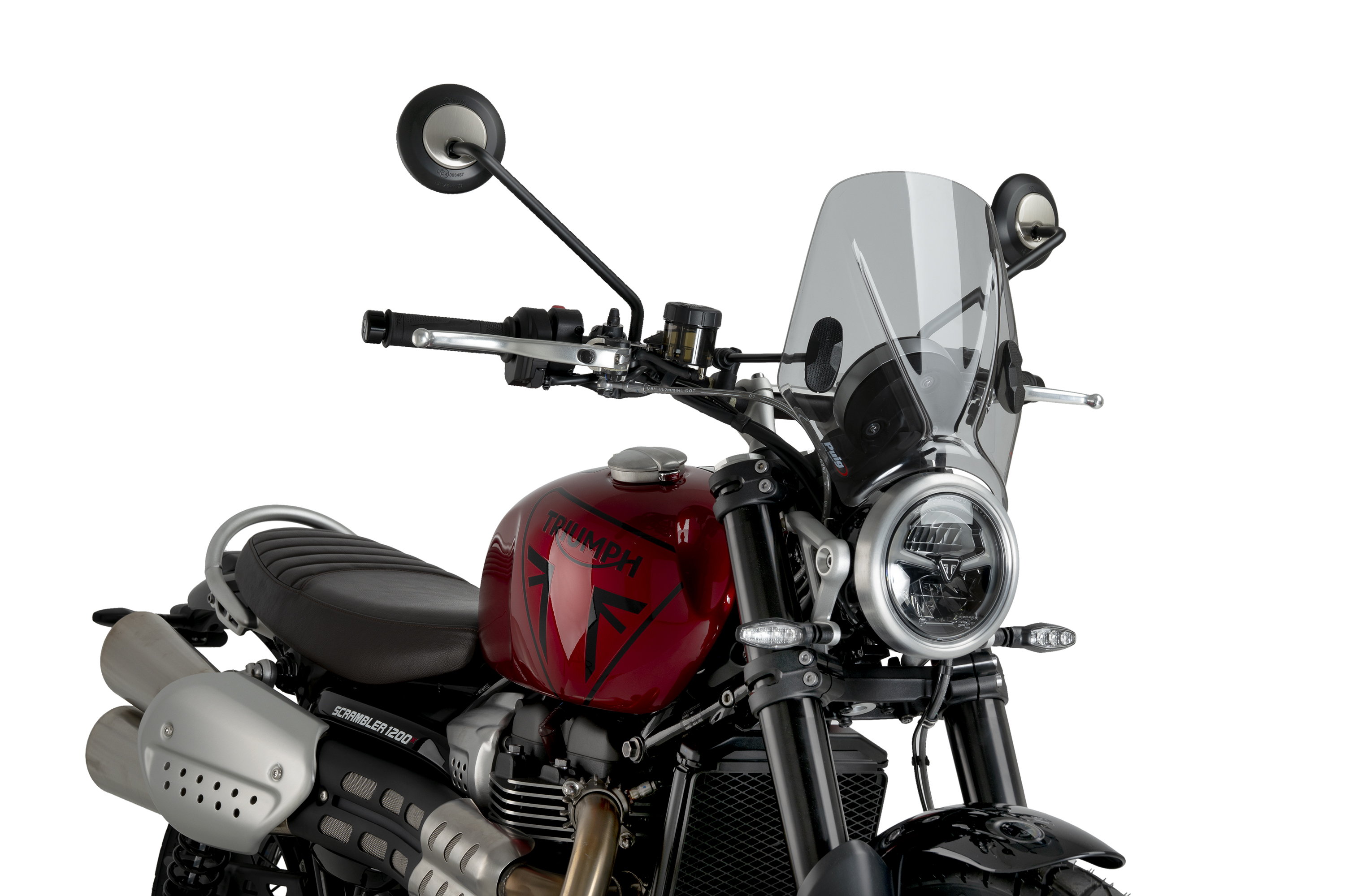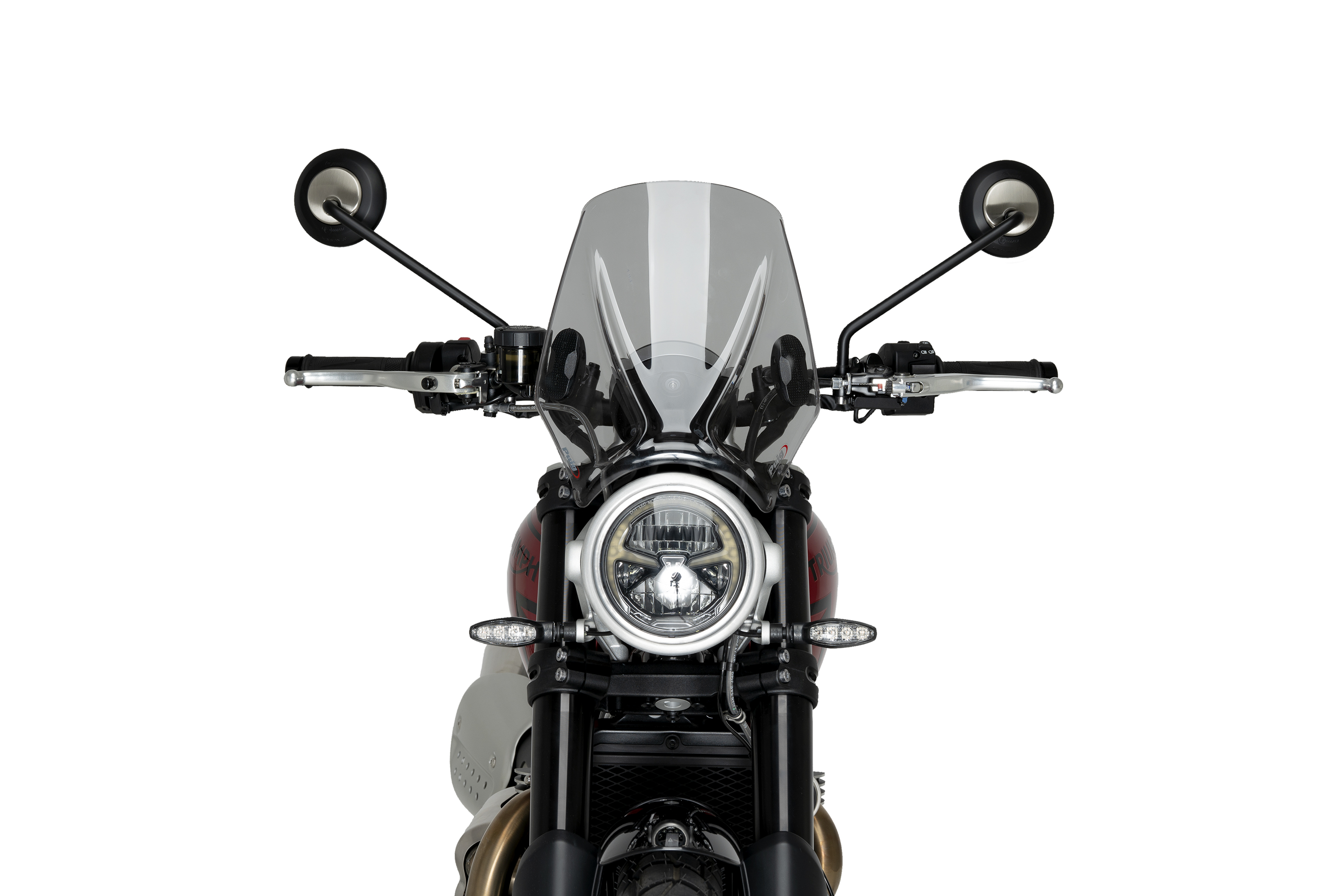 Improve the riding of your motorcycle and give it greater safety with the new Mito windshield from Puig. Thanks to its sober lines, its modernized classic character will give your vehicle more personality, being adaptable to motorcycles with round headlights.