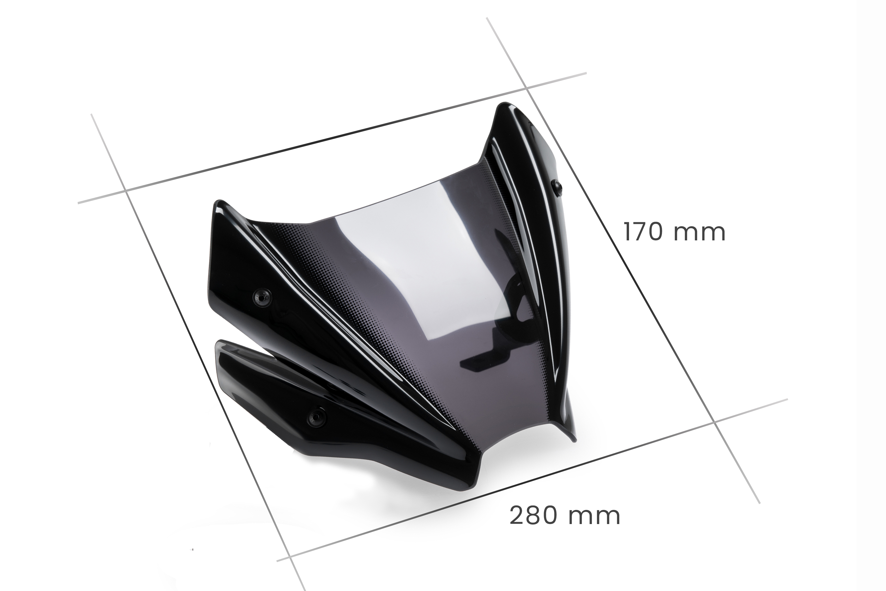 Its total measurements are 280mm wide by 170mm high. The upper part of Puig's Sport NG screen protrudes 65mm from the handlebars of the Suzuki GSX 8S.