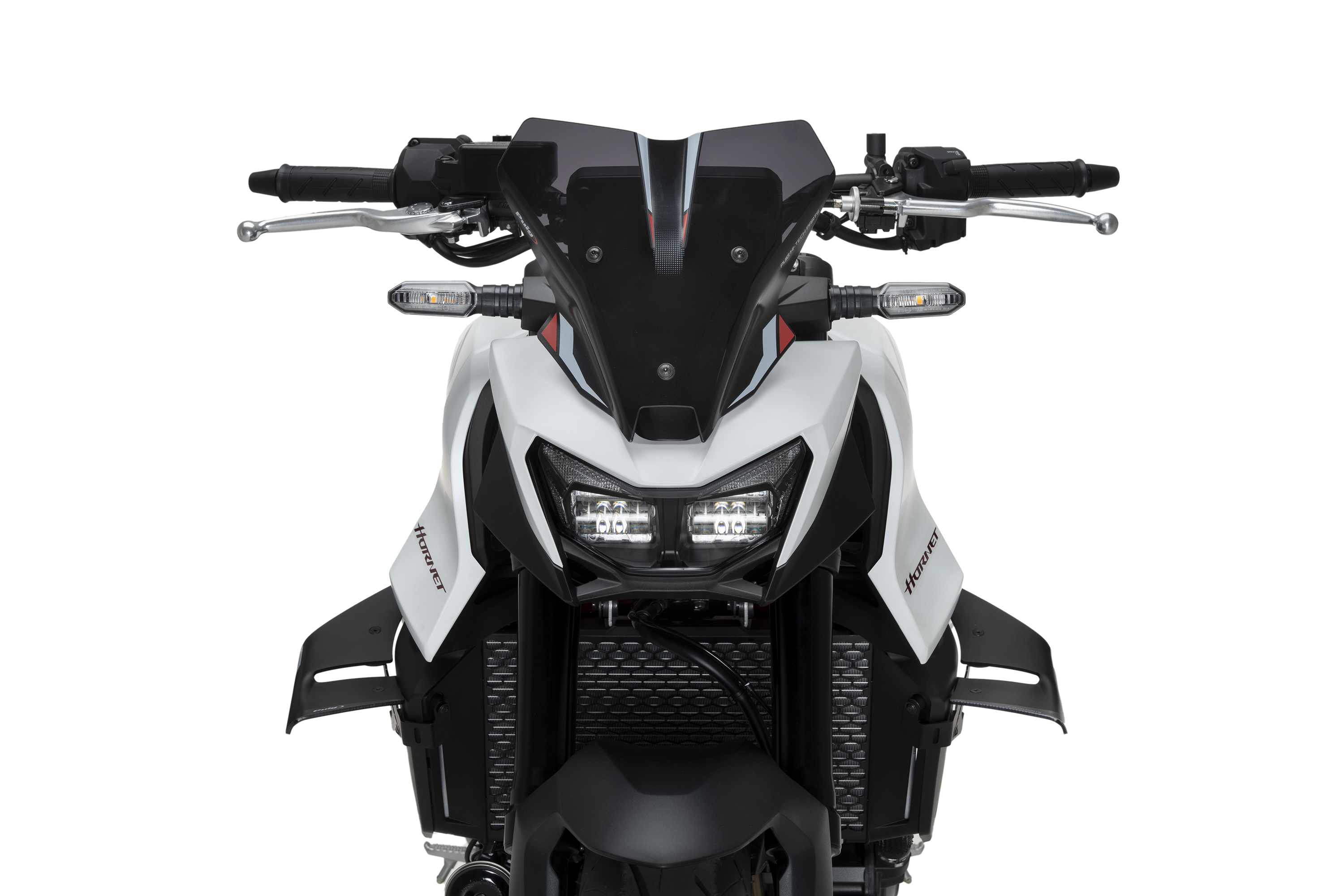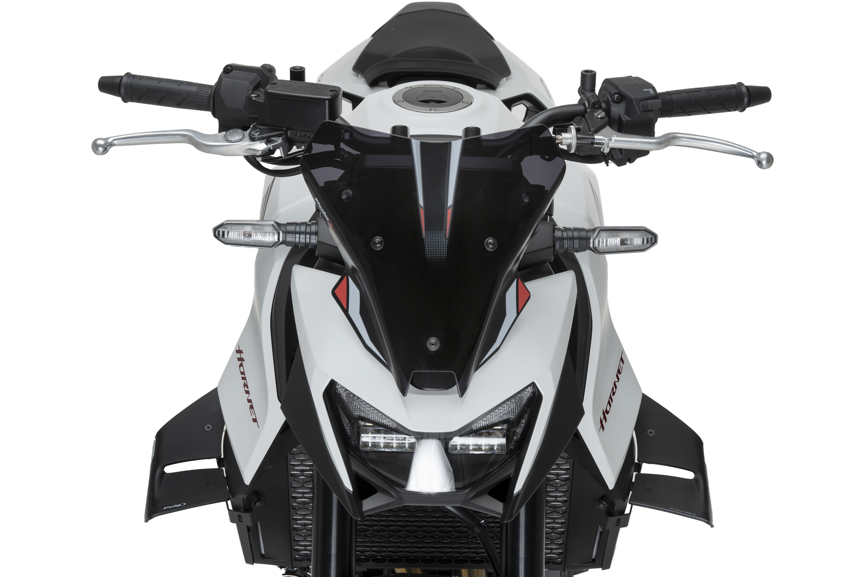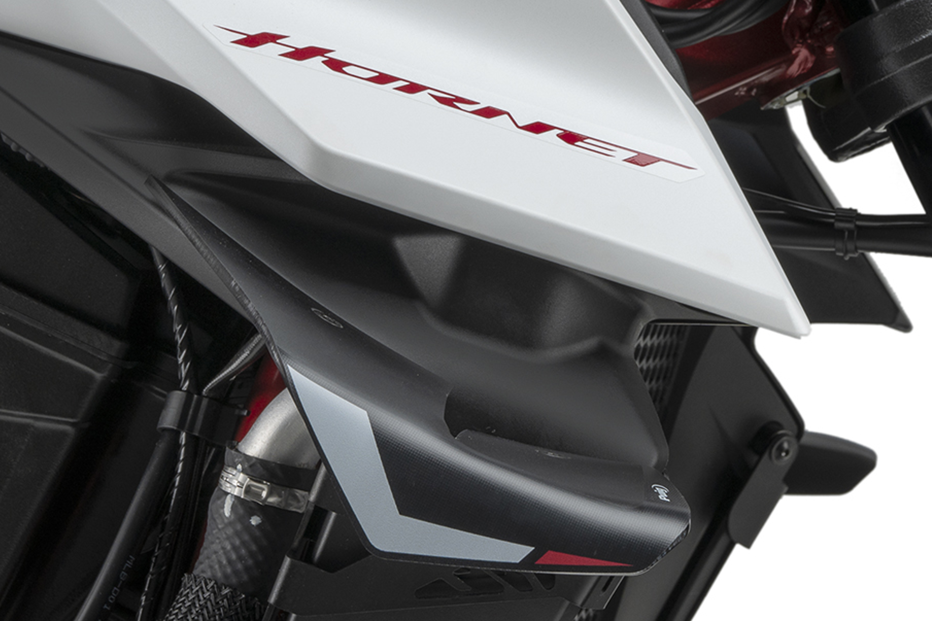 El nuevo alerón lateral D12 para la Honda CB750 Hornet ha sido diseñado con un enfoque puramente aerodinámico, priorizando el rendimiento en conducción deportiva sin comprometer la estética. Gracias a su innovador sistema de doble ala y winglet lateral, se consigue canalizar el flujo de aire de forma eficiente, generando una carga aerodinámica (downforce) notable sobre el eje delantero. Esto se traduce en mayor aplomo en frenadas fuertes, efecto anti-wheelie y mayor estabilidad en curvas y a altas velocidades (anti-shimmie).