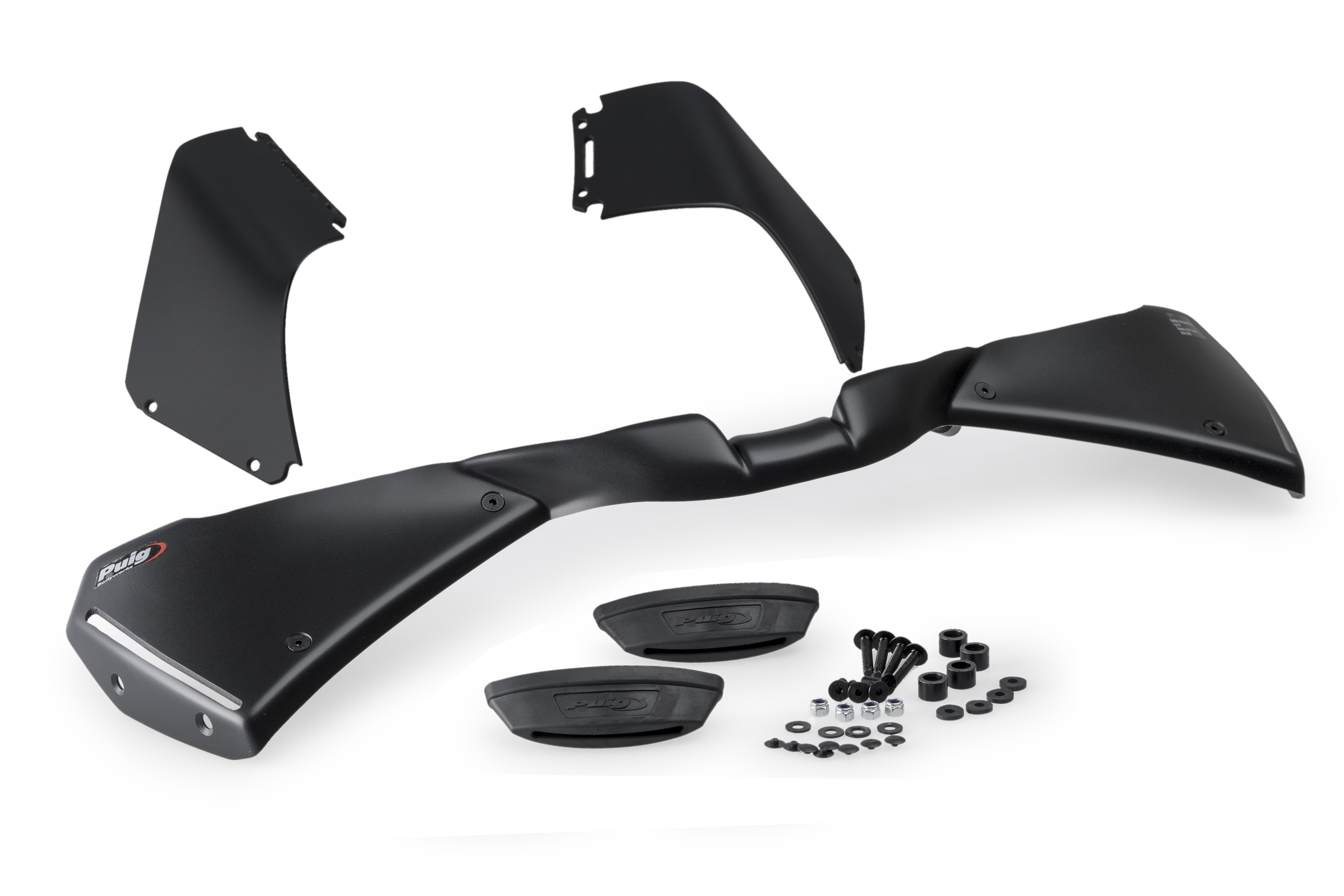 Refuerza la estética Racing y mejora la aerodinámica de tu moto con el nuevo alerón frontal GP de Puig.