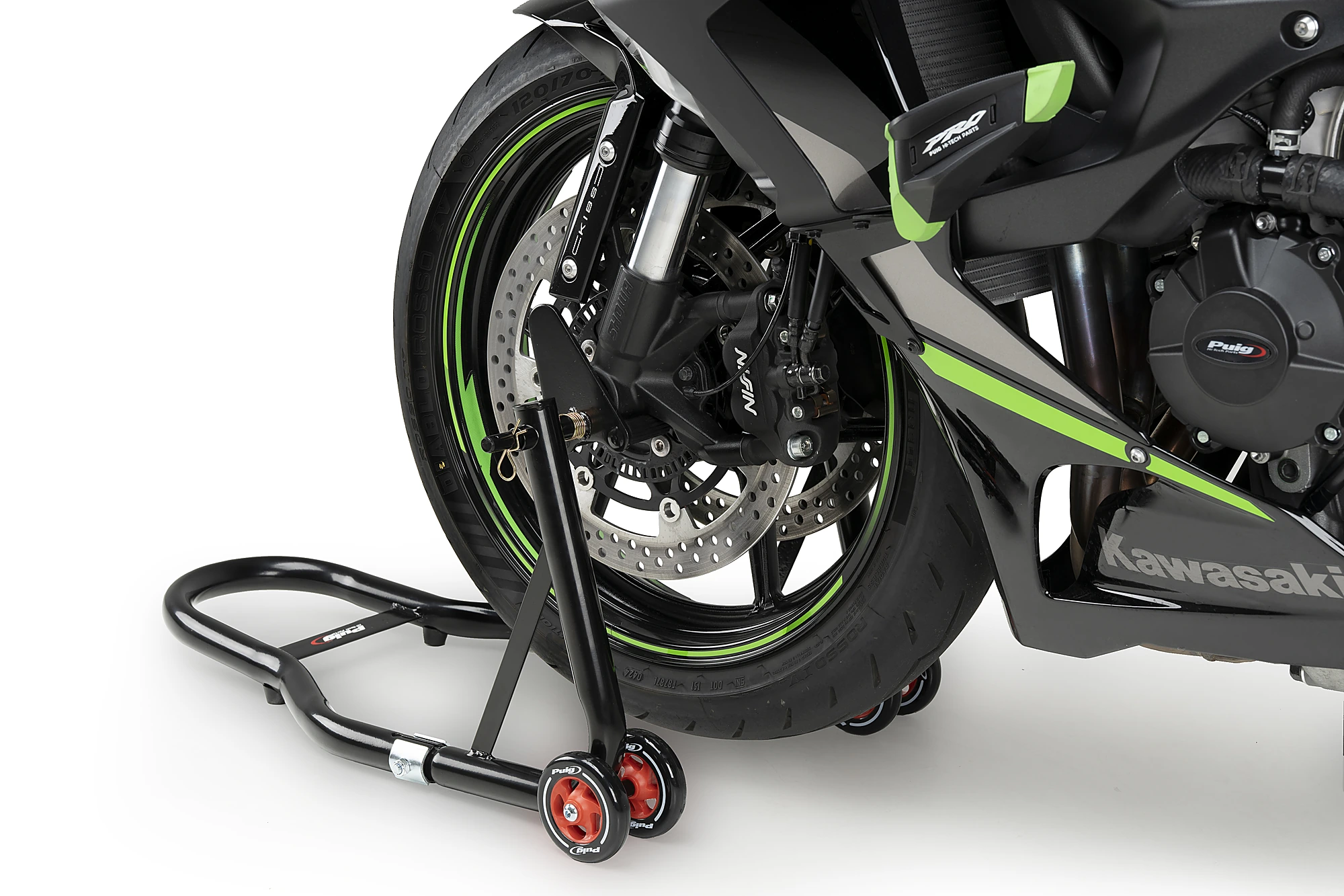 El caballete delantero para moto de Puig es el accesorio ideal tanto para los usuarios particulares que la mantienen estacionada durante largas temporadas como para los que pisan los circuitos con frecuencia.
