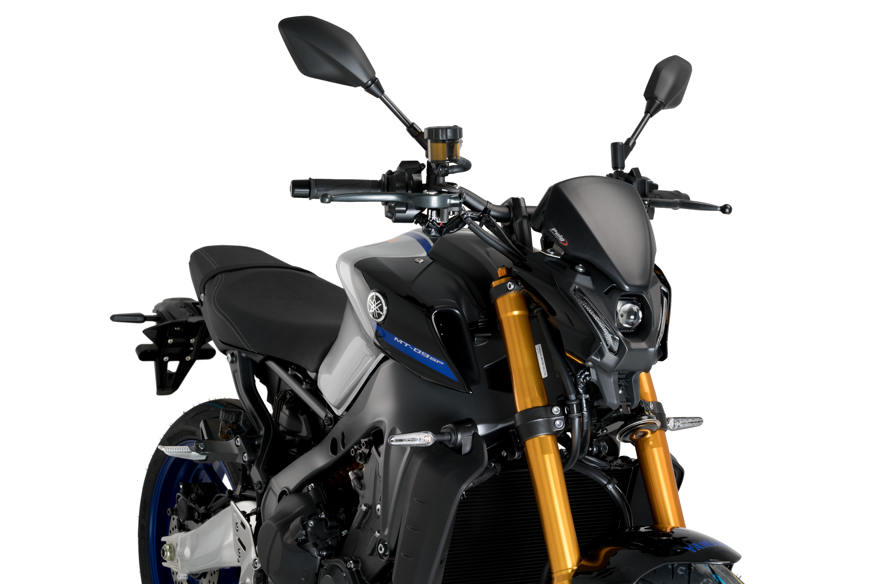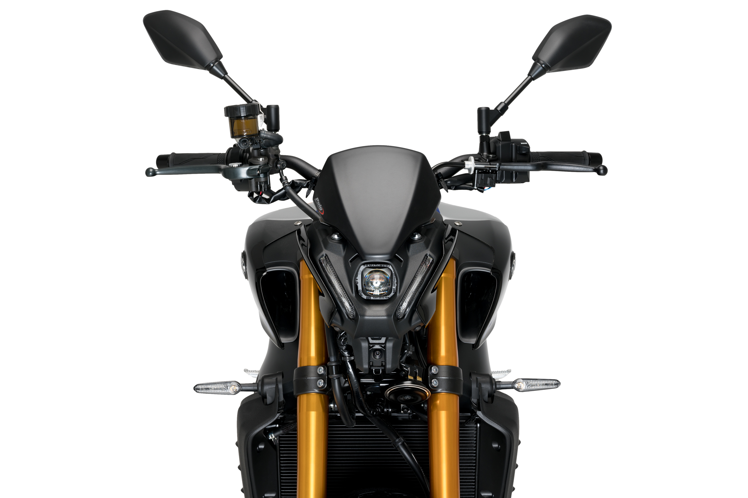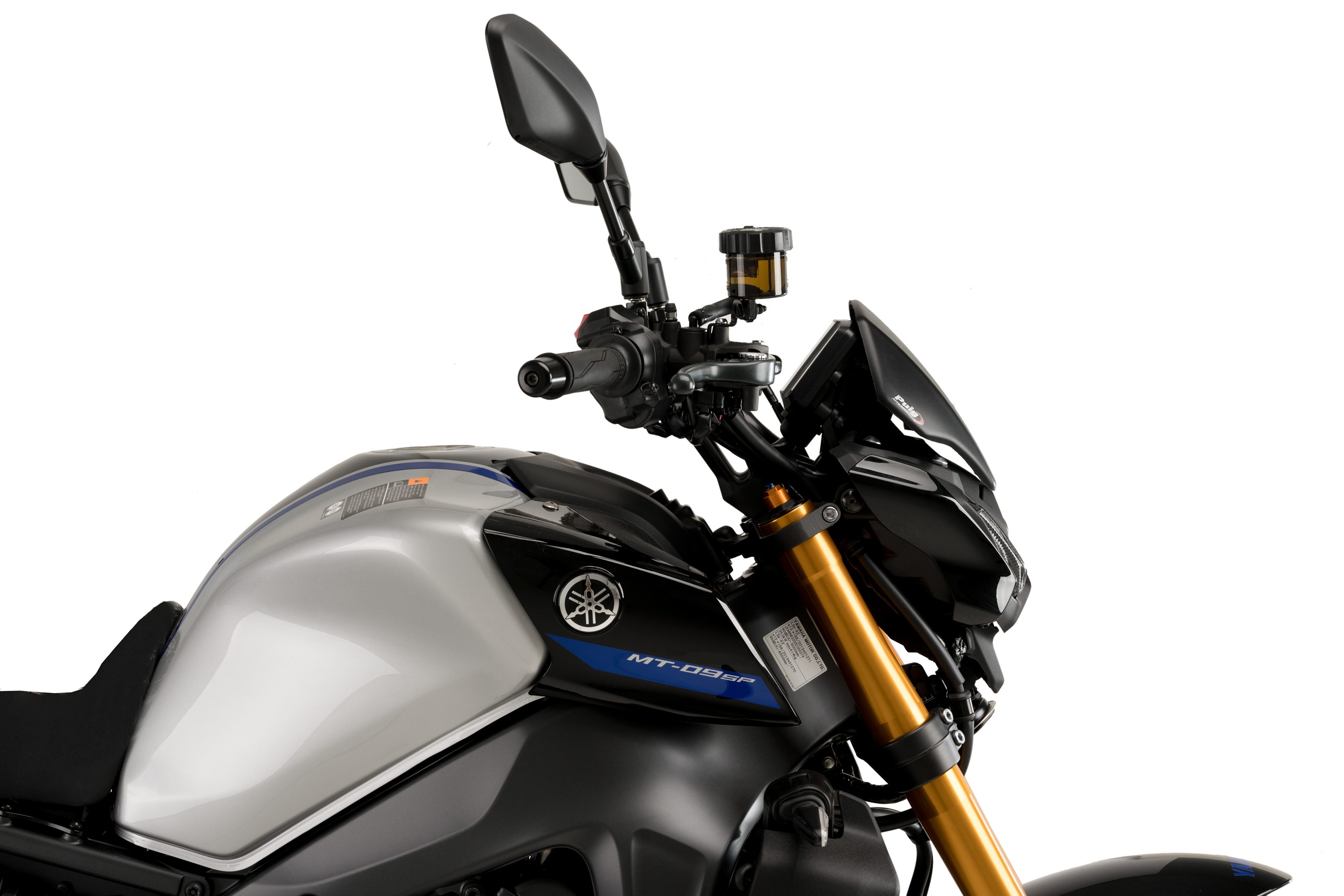 Realizada específicamente para la Yamaha MT-09 SP 2022 su diseño minimalista en color negro mate encaja perfectamente con la estética agresiva de la naked de Yamaha, cubriendo el hueco original que hay entre el faro y el cuadro de instrumento.